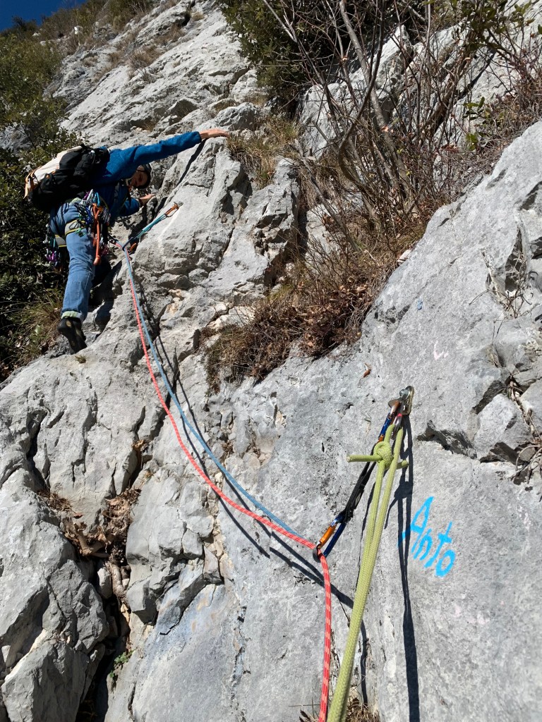 L’idea di provare questa parete mi è stata lanciata da un amico che mi ha inviato lo schizzo di alcune vie. La particolarità è comunque che per arrivare all’attacco si deve scendere in doppia partendo dal guard – rail lungo la strada per Ranzo. Individuata la catena di discesa abbiamo iniziato le calate due corde doppie da sessanta metri che ci portano alla cengia dove partono le vie. Le più vicine sono a destra faccia a valle, Buba, la via di Mario Leone e Anto. La vista è spettacolare e spazia dal lago di Toblino fino al Lago di Garda. Noi abbiamo iniziato con la via Anto e fin dal primo tiro abbiamo notato che i fix erano più distanti e la roccia non sempre eccellente e pulita(forse ci siamo abituati troppo bene negli ultimi tempi). Kurt brontolava sulle prese sporche di terra e giunti in sosta ci scambiavamo le nostre impressioni sui gradi e facevamo confronti con le vie di Grill e Galvagni. Le protezioni così distanziate obbligano a una concentrazione maggiore e quindi a un maggior impegno. L’ultimo tiro presenta il passaggio chiave(6b) e supera un piccolo tetto e poi un breve traverso verso destra per entrare nella placca finale a destra di un diedro.