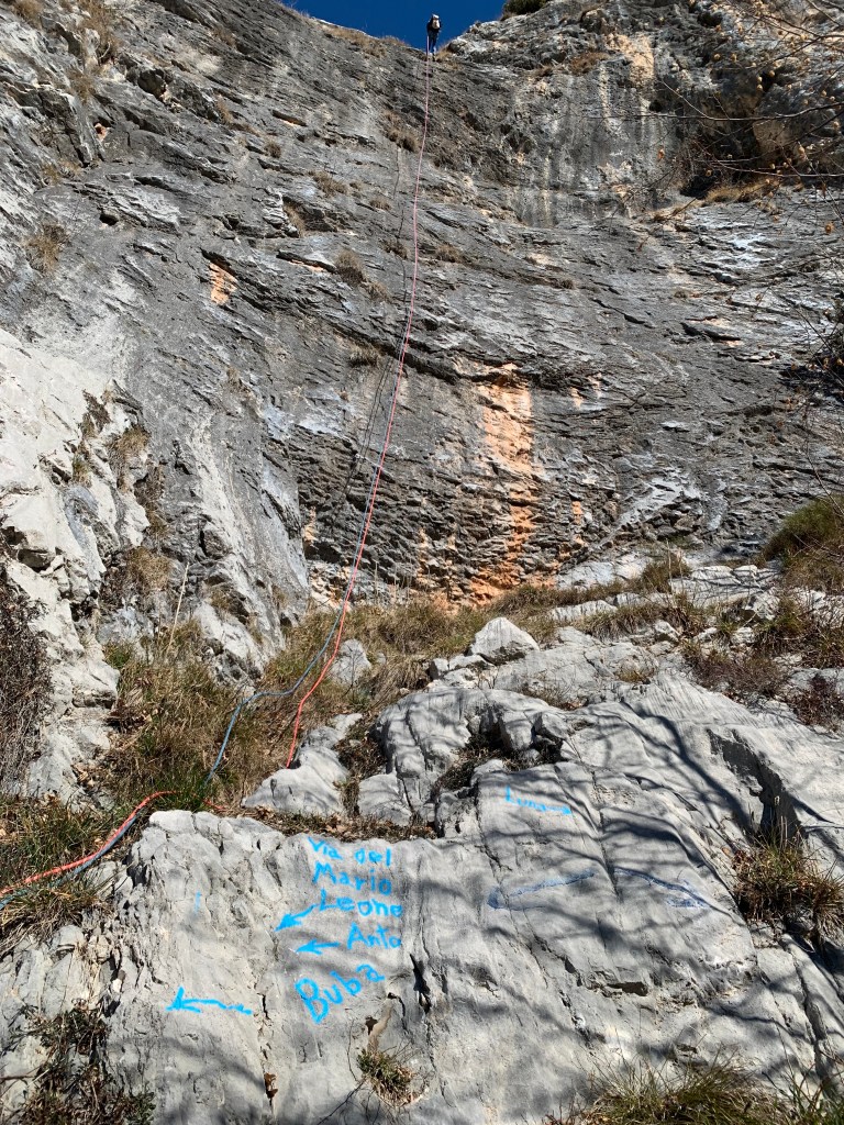 Di nuovo calate in doppia e questa volta si attacca la via di Mario Leone che inizia con protezioni ravvicinate poi più sù in un diedrino delicato trovo una maglia rapida annunciatrice di una ritirata e alzandomi in alto verso una nicchia su roccia bianca probabilmente roccia franata faccio la sosta dove vi è un fix e due clessidre e l’ombra. I piedi sono doloranti per il caldo e la nicchia arriva a proposito ma la vera sosta è cinque metri più in alto ma fuori dalla mia vista.