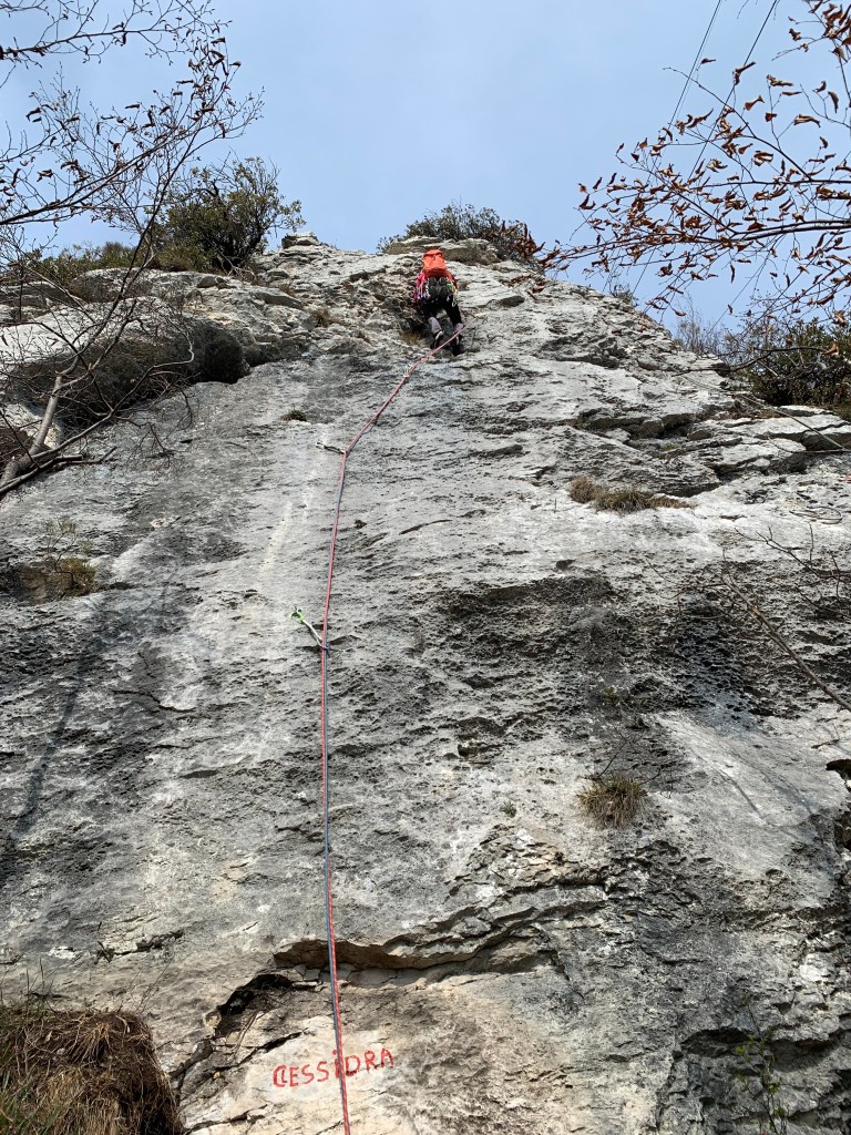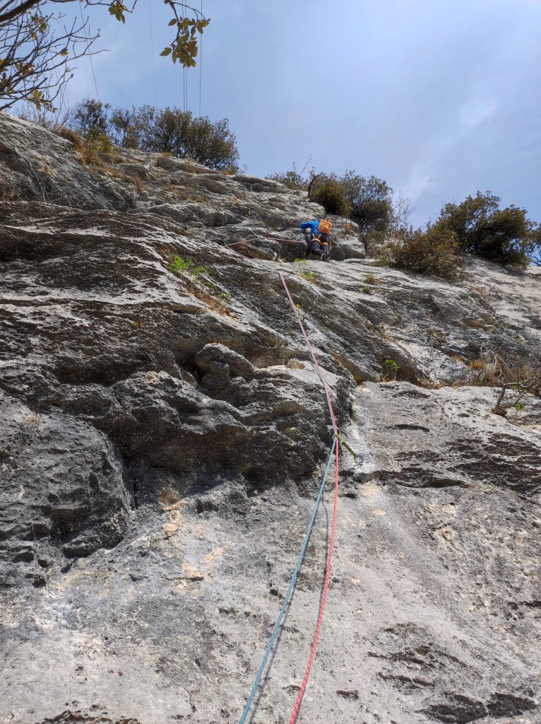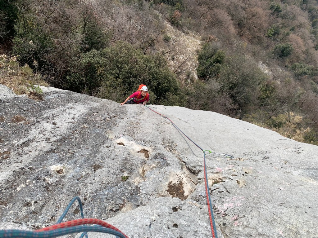 Abbiamo nel cellulare uno schizzo fatto in maniera un po’ frettolosa e lo seguiamo. La via attacca qualche metro a sinistra della via Ciao Rita, i primi metri sono ancora un po’ sporchi di terra ma con un po’ di pioggia si puliranno. Il primo tiro sale su roccia articolata e un po’ adagiata per c.a. 20 metri con difficoltà di 4 e 5+ con tre fix a protezione.