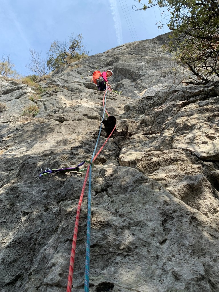 Il seguente, secondo me è il tiro chiave della via, inizia salendo un piccolo muretto sotto uno strapiombo con andamento verso destra, poi si prosegue in dülfer fino a moschettonare un cordone, si sale ancora con andamento prima a sx e poi a dx, ora si punta ad un albero ma si vedono comunque i fix, ora le difficoltà si abbassano e arrivo in sosta (6,7,6+,5+ e 5).