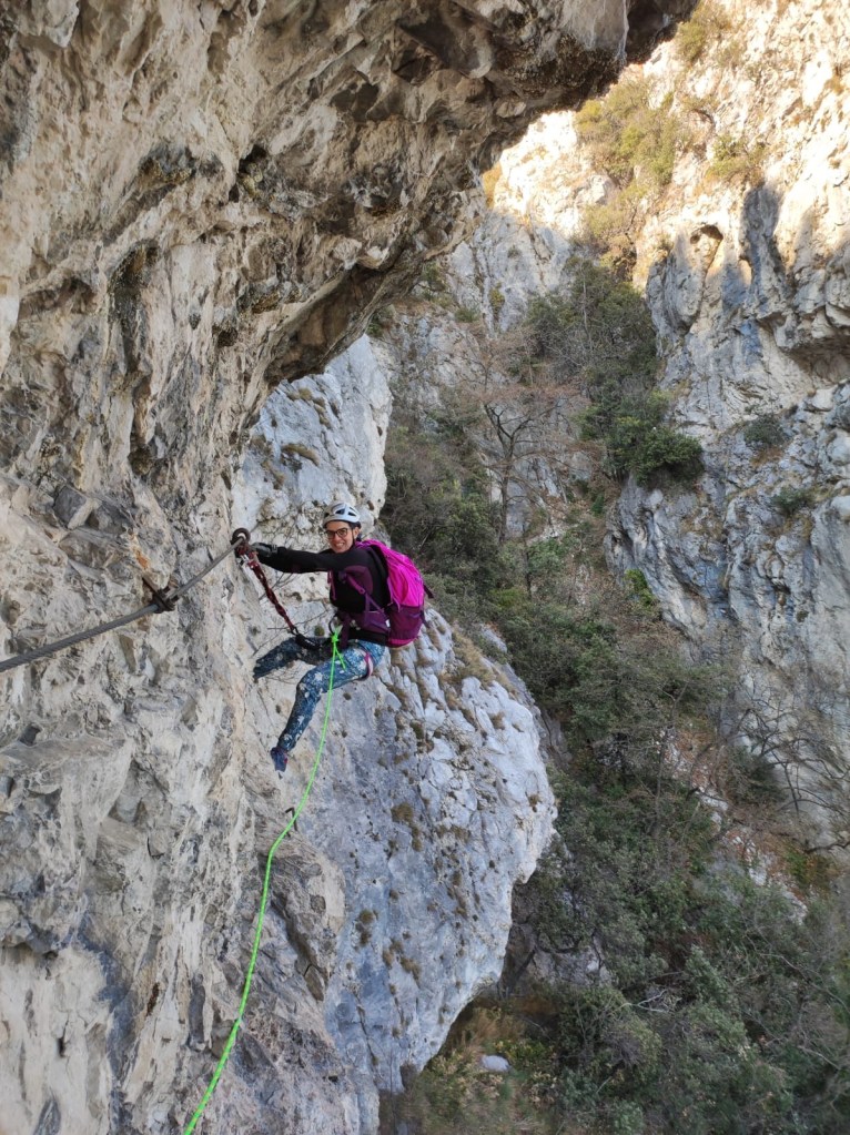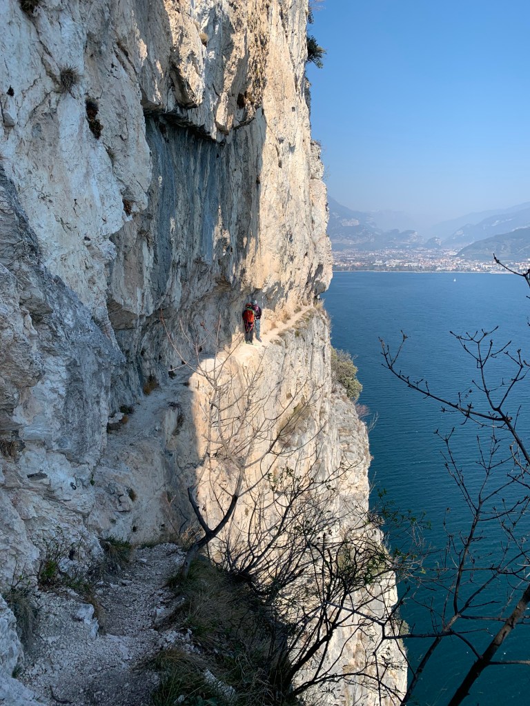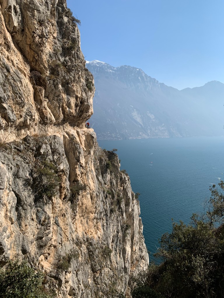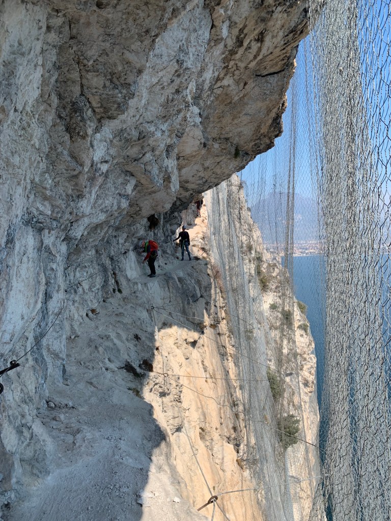 Il lago di Garda che si vede sullo sfondo appare in prospettiva lontano ma attrae come una sirena luccicante facile da afferrare. La partenza vera e propria avviene insinuandosi tra la rete paramassi e la roccia che dona falsa protezione perché in realtà lo spazio tra lo stretto sentiero ed essa è sufficiente a inghiottire chi non presta attenzione a dove pone i piedi.