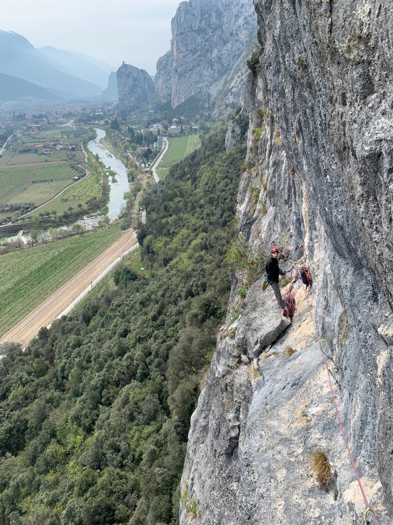 La seconda lunghezza ci dà respiro, ( 5b, 6°+ e 5a ) dopo aver rimontato un muretto sopra la sosta, troviamo una cengia da dove parte una placca delimitata alla sinistra da un diedrino fessurato che aiuta nella salita. Il superamento del successivo strapiombo è un po’ delicato e una volta sopra, si va in diagonale a sinistra fino alla sosta. Una quindicina di metri alla nostra destra, una coppia di tedeschi che volevano fare la nostra stessa via sono invece ripiegati sulla più facile “Ape Maia”, procedono spediti.