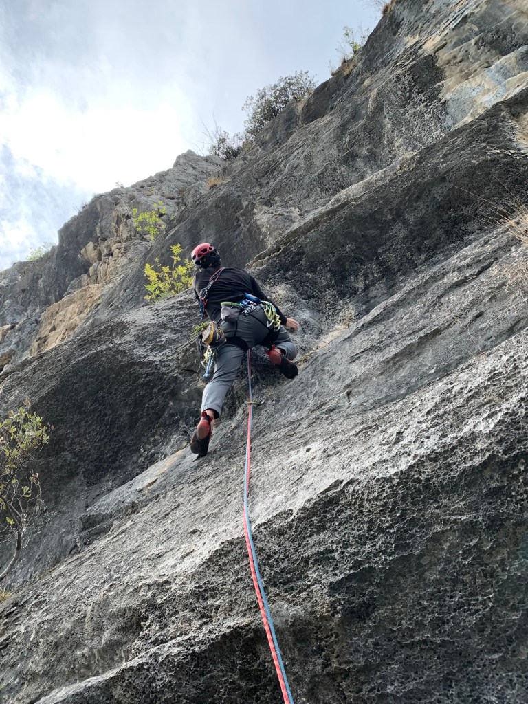 Il primo tiro lo danno 6b, 6c/A0 e 6b, una bastonata tanto per iniziare. I primi metri sono all’ombra e già inizio a spalmare i piedi per arrivare dopo due prese verticali ad una buona maniglia. La placca successiva delimita un diedro cieco e poco accentuato che sale verso l’alto, le piccole gocce e piccole prese sono perlopiù unte e consigliano di afferrare i rinvii per progredire. Per uscire alla sosta i metri di roccia te li devi sudare tutti. Sembra che tutto l’allenamento settimanale nella palestra indoor sia tempo sprecato. Ora recupero Nelson che vedo anche lui impacciato progredire lentamente. Sopra di noi a distanza di un tiro vedo la seconda di cordata avvinghiarsi ai rinvii caricata con uno zaino enorme.