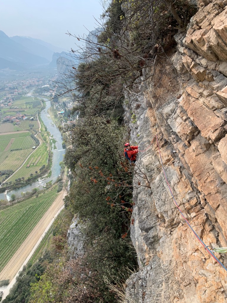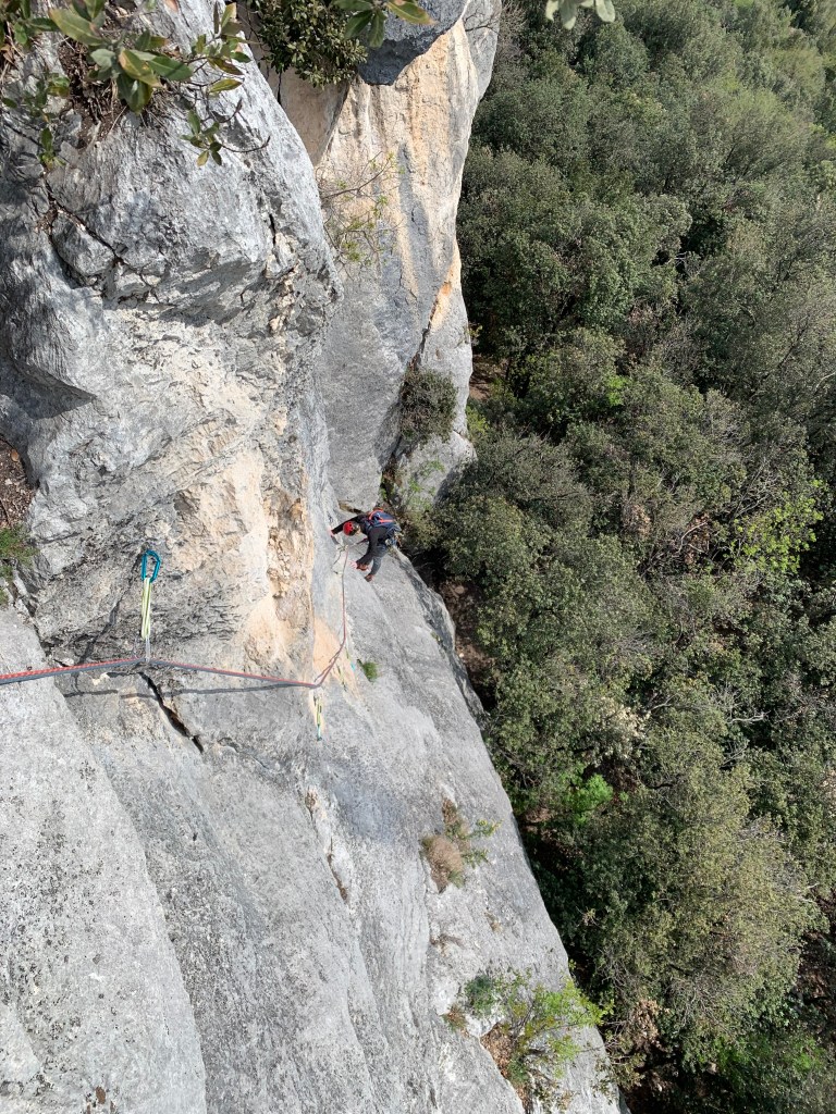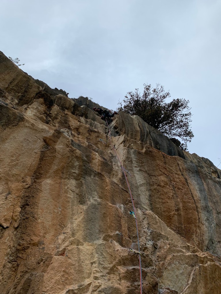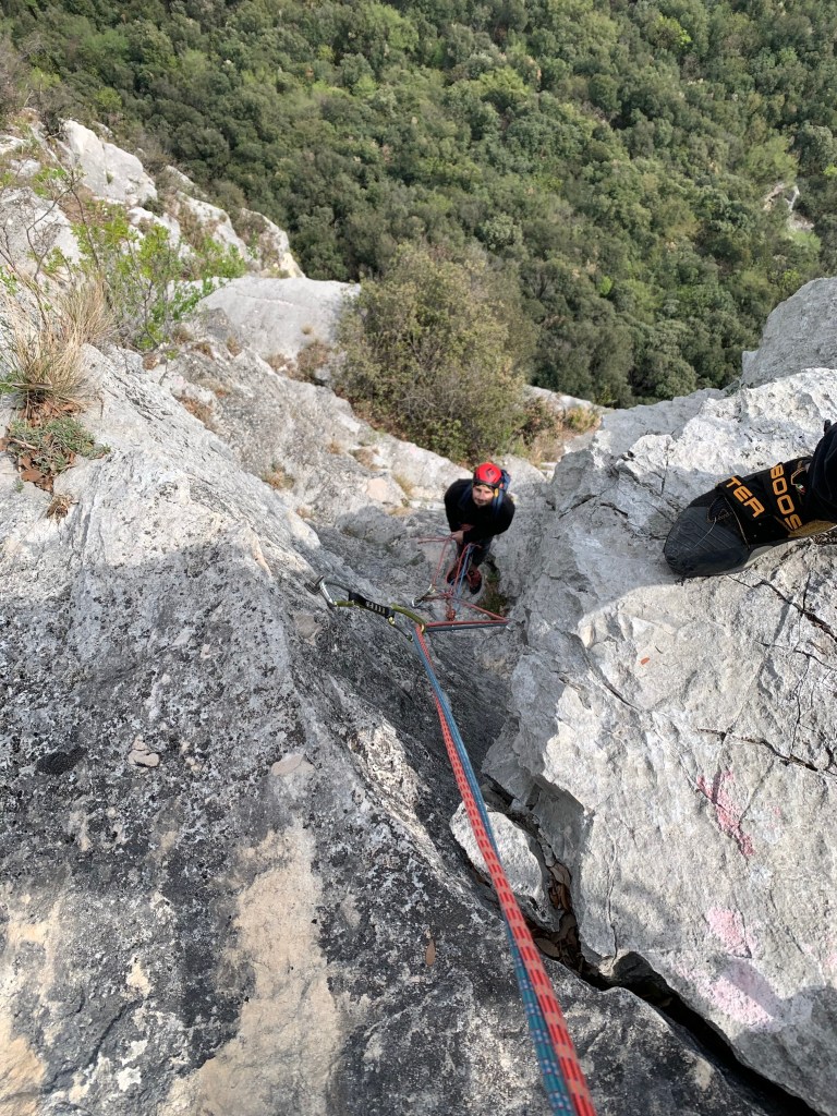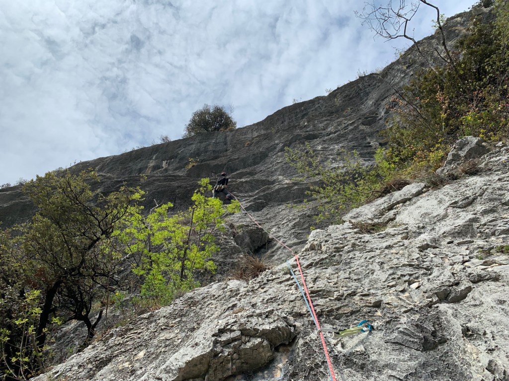 A questo punto abbiamo sopra di noi il tiro finale lungo una quindicina di metri ma è ben protetto e due cordoni penzolano nella parte centrale del tiro. Le difficoltà iniziano con il 6b per continuare con 6c o A0 e terminare con 6a. Noi abbiamo azzerato sul 6b e 6c e siamo usciti felici e contenti.