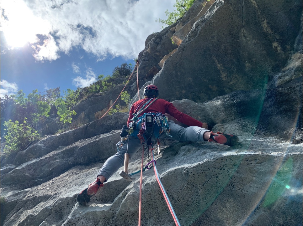 Bravo Nelson! Ci lascia una lunga fettuccia appesa per aiutarci a salire questo sarà sicuramente il passo chiave. Io con la mia paletta da giardino cerco di liberare una fessurina orizzontale per poter successivamente utilizzare con una mano e poi ancora altre zolle e finalmente in sosta.