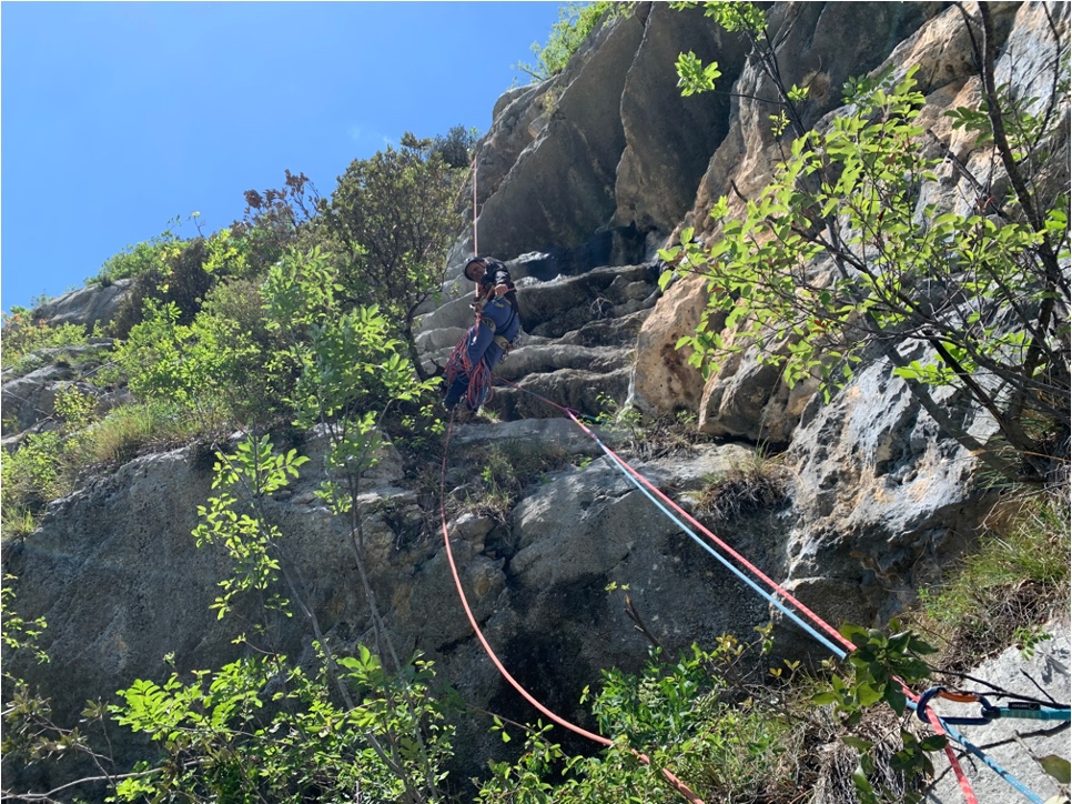 Questa volta ci siamo calati, due doppie ed eravamo all’ultima sosta. I tempi sono lenti causa vegetazione fastidiosa che frenava continuamente il recupero delle corde mentre si scendeva. Abbiamo comunque lasciato una corda fissa lungo i tiri che ci permetteva un eventuale ritirata. Ero comunque un po’ pensieroso per la poca esperienza in merito dei miei compagni ma contento di far provare anche a loro l’avventura “apertura”. Abbiamo un po’ barato, ma comunque la corda fissa ci dava la sicurezza che difficilmente potevamo non finire il lavoro.