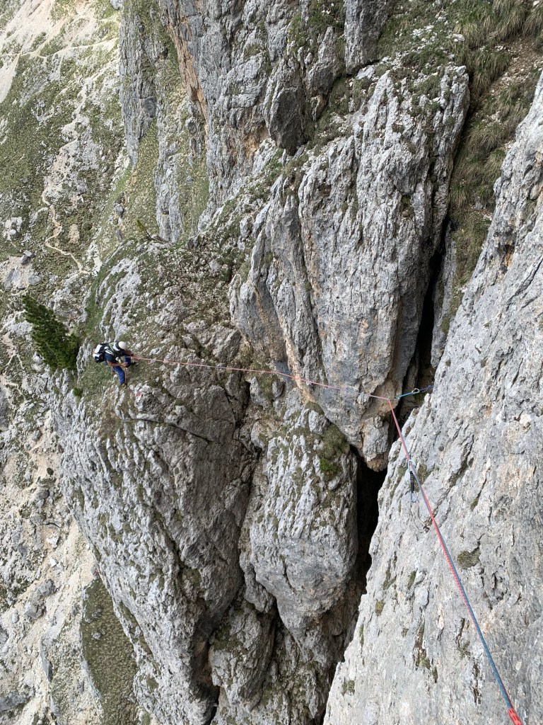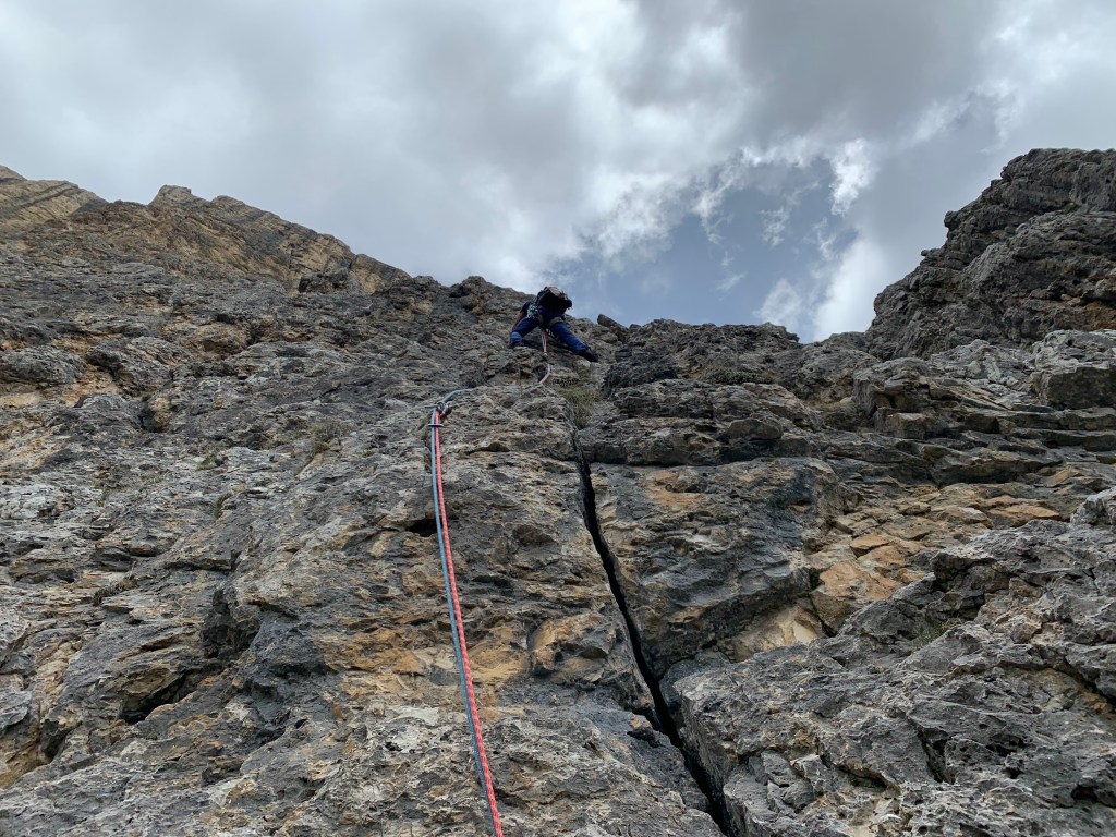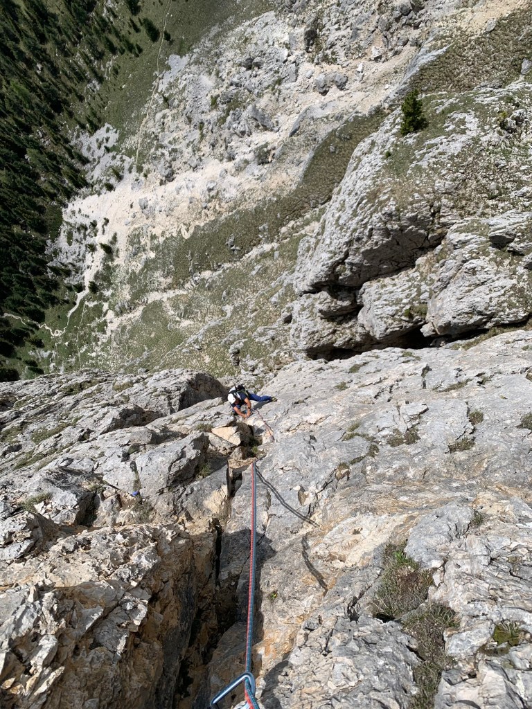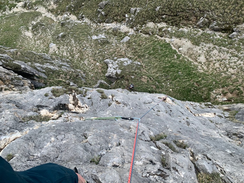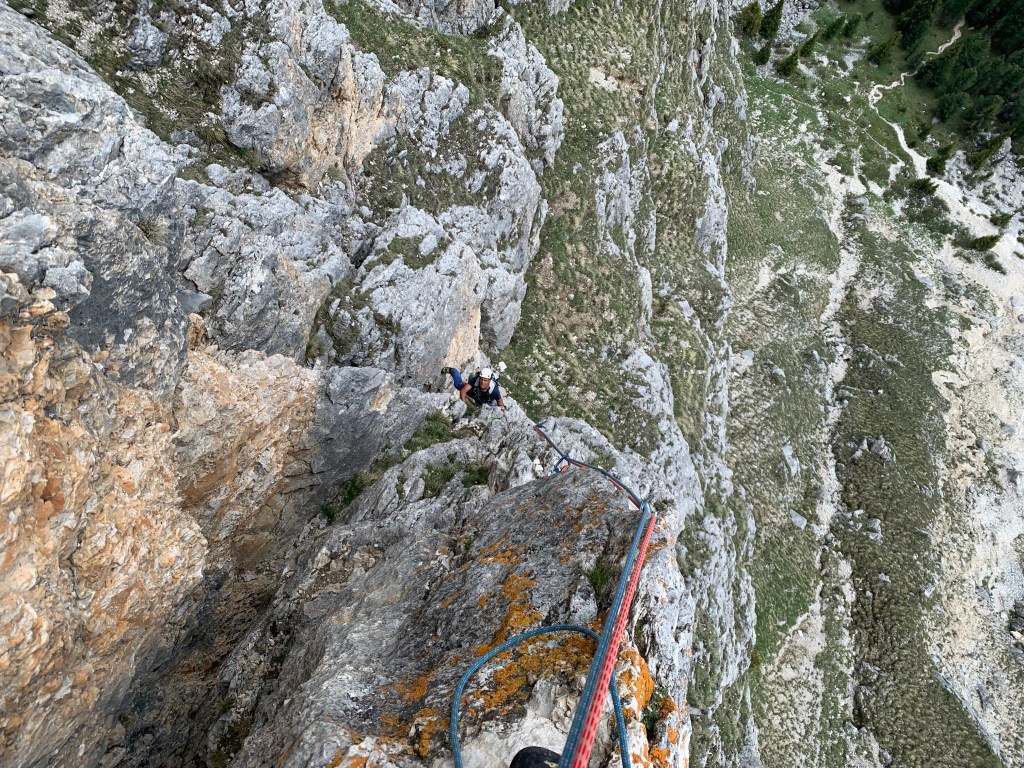 La lunghezza seguente supera da subito un passo un po’ strapiombante iniziale puntando a un cordone qualche metro più sopra giungendo poi alla cima del pilastro che si lascia posandoci sulla parete che troviamo davanti con leggero strapiombo ci spostiamo un po’ a destra fino a un chiodo con fettuccia per proseguire diritto sul diedro che proviene dal basso alla nostra destra e si continua su diritto fino alle zolle erbose della cengia dei camosci dove troviamo il sentiero di discesa e l’anello cementato sulla parete.