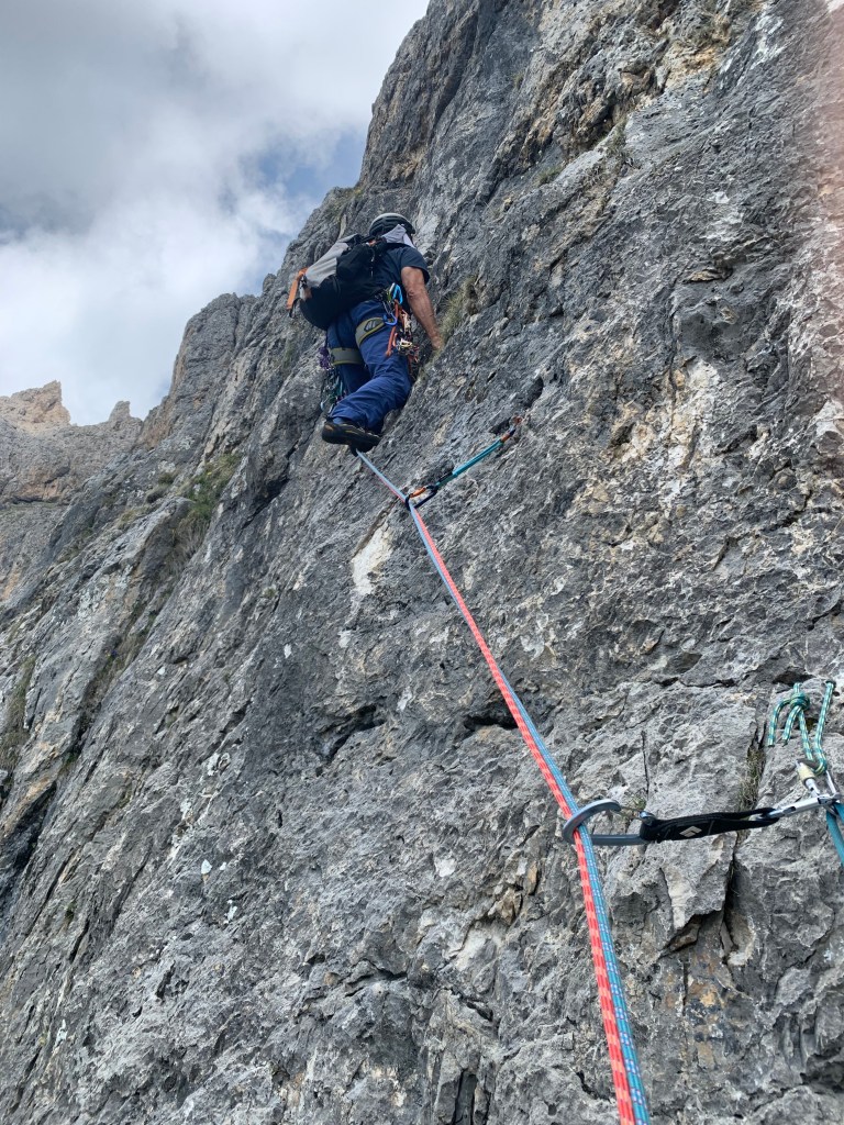Oggi siamo andati in quota, viste le alte temperature della città al passo Sella erano decisamente migliori. Qualche nuvola in cielo ma nulla di preoccupante. Al passo era in corso una gara ciclistica amatoriale ma i turisti erano pochi. Abbiamo trovato subito parcheggio e ci siamo fiondati alla base della nostra via prescelta di oggi, la via del cono. Una via corta sulla parte sinistra del Piz Ciavazes, aperta da Grill e compagni nella primavera del 2022.