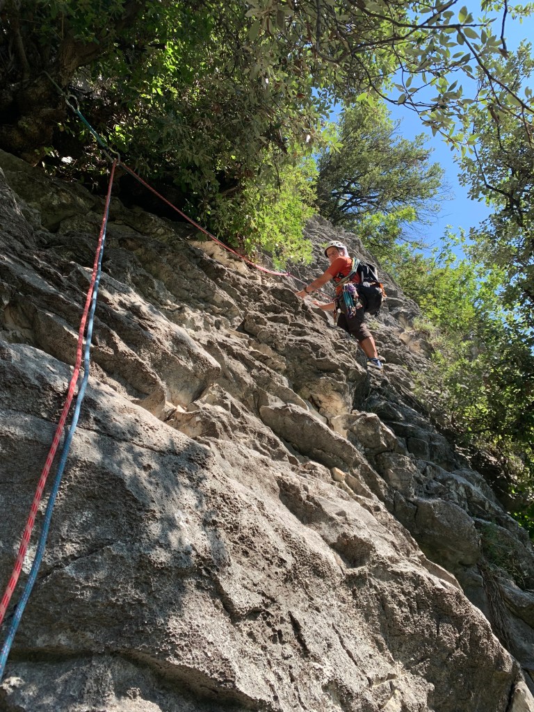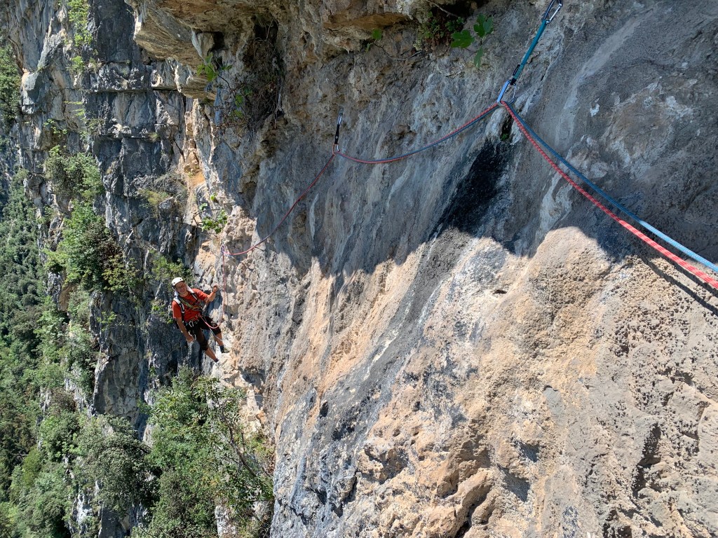 Il sesto tiro è corto 12 metri di traverso a destra sotto a un tetto fino a raggiungere la sosta sempre su fittone con anello.il settimo tiro è quello chiave, si traversa a sinistra sotto ad un tetto che si supera abbastanza facilmente per poi salire diritto su roccia gialla con prese obbligate fino ad uscire alla sosta. L’ottavo tiro parte a destra della sosta su diedro articolato con movimenti atletici .
