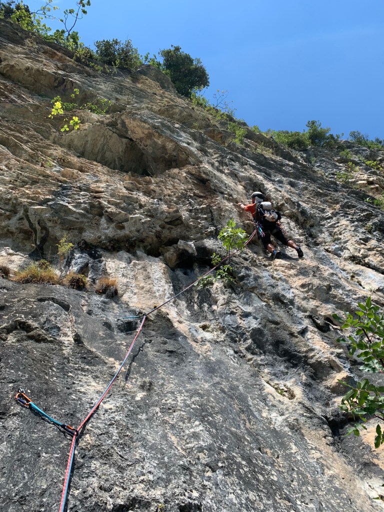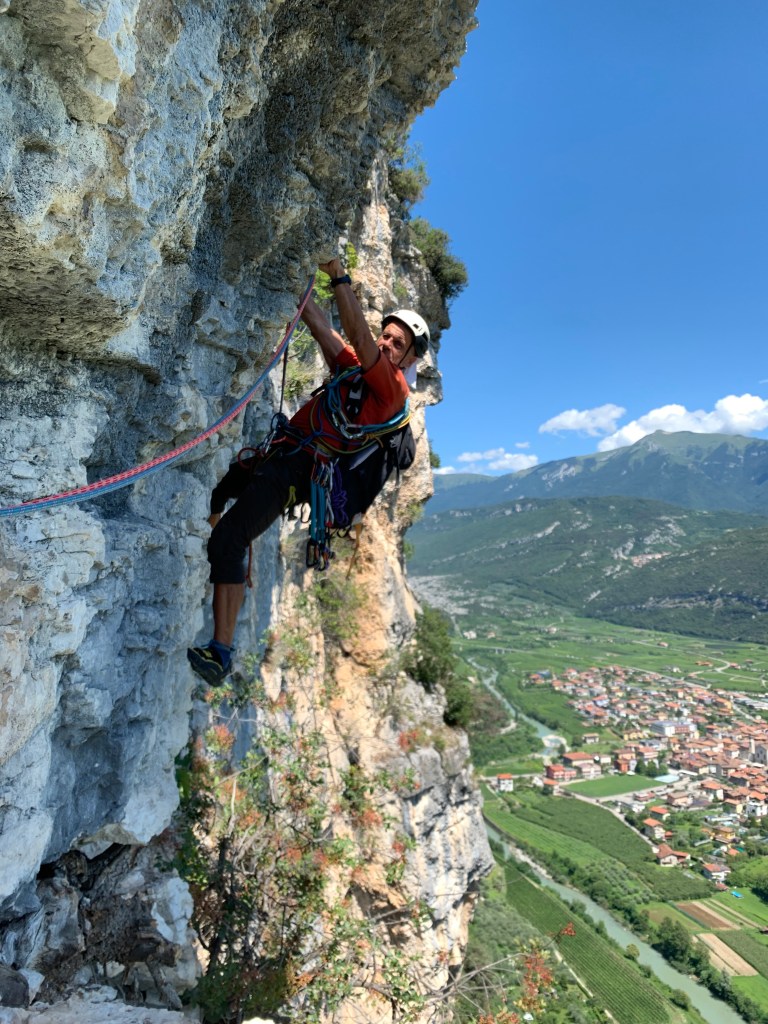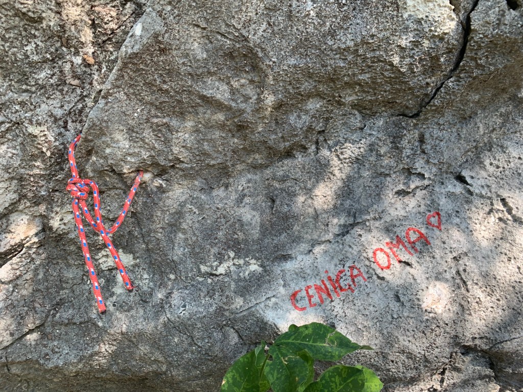 Ieri complice la temperatura più mite siamo scesi in valle del Sarca per cimentarci con la recente via Ceniga Oma aperta nel 2021 da M.Bernardi. La via si trova accanto(qualche metro più a destra) alla più nota “via Attraverso la Friabilità”aperta da Grill e Compagni nel 2013. All’attacco scritta con cordino in clessidra.