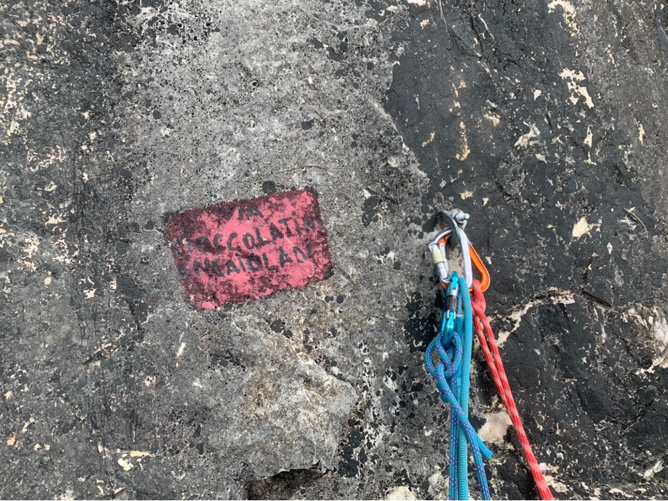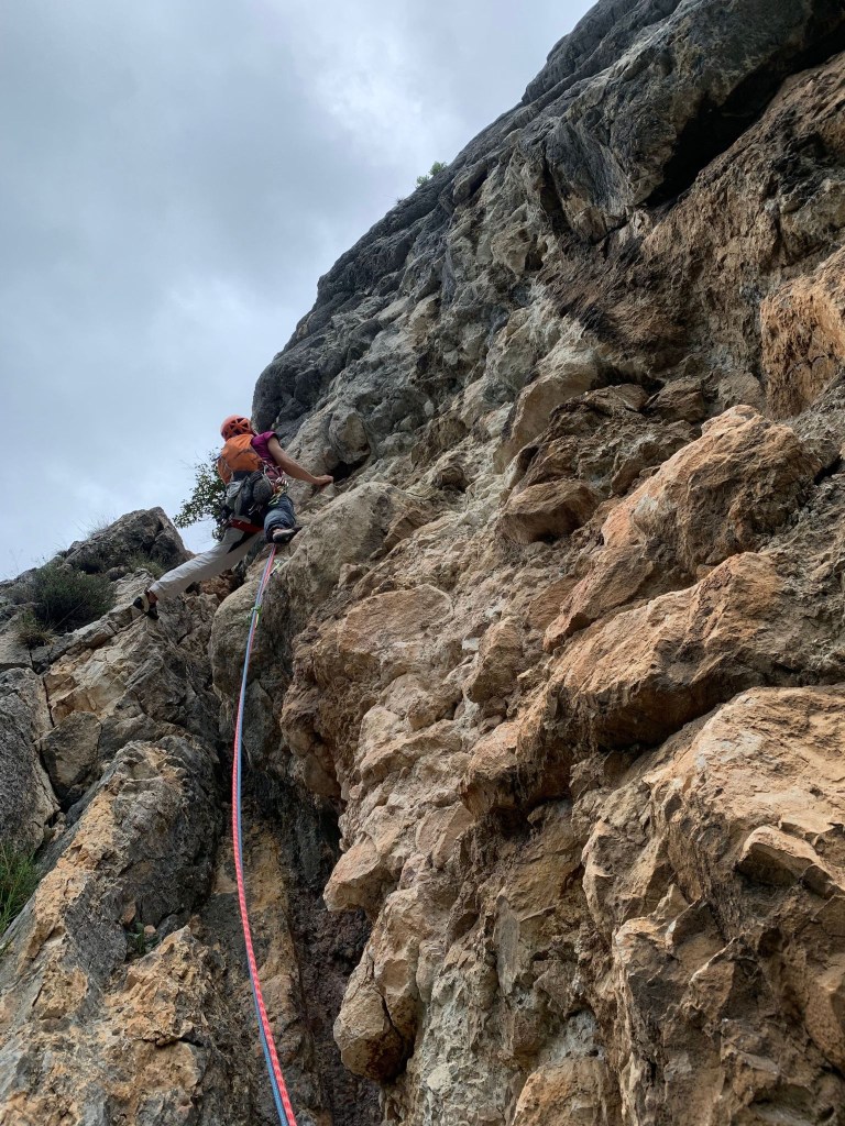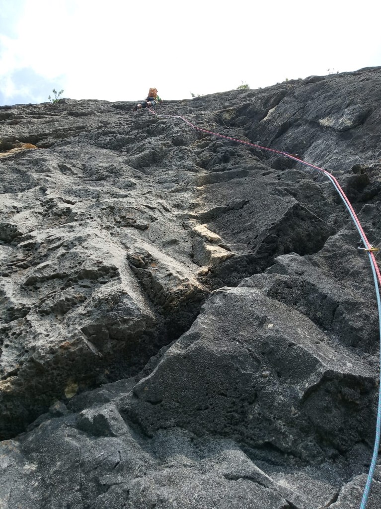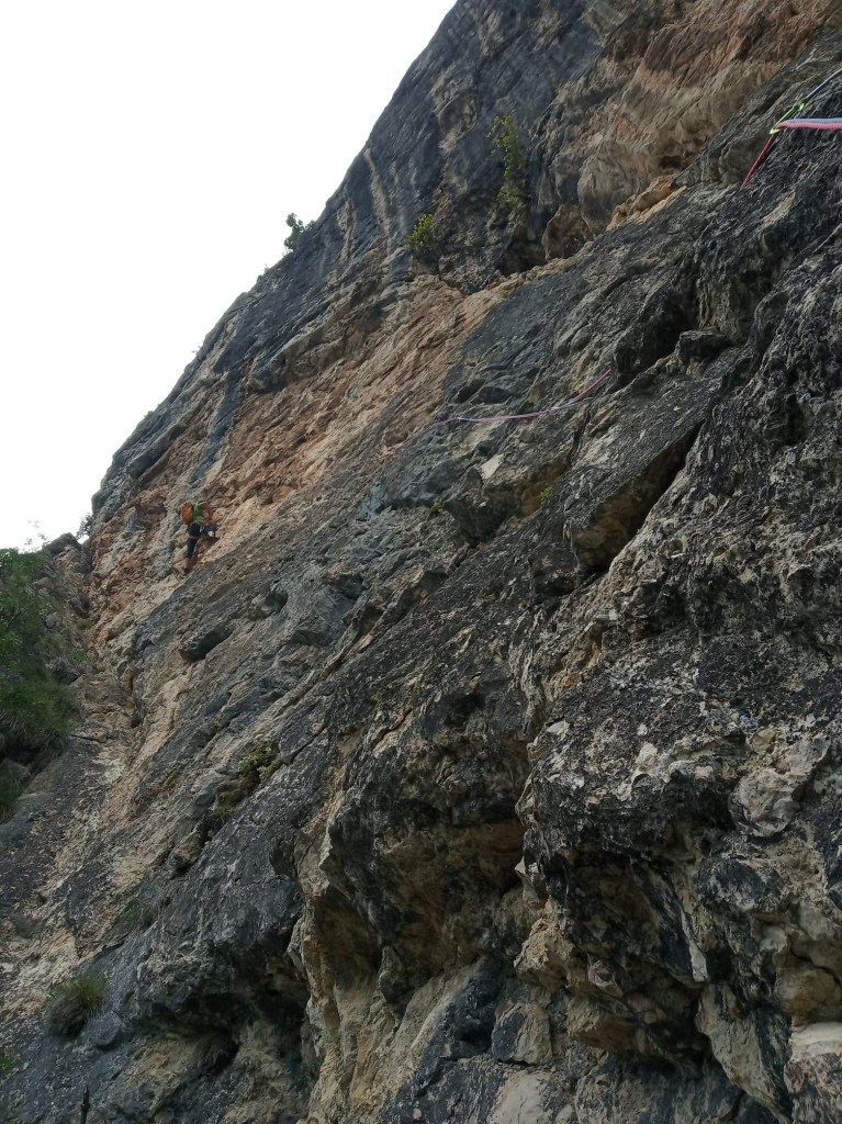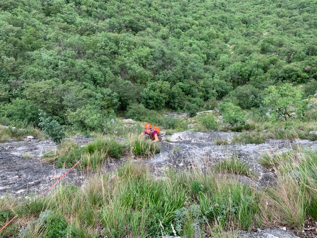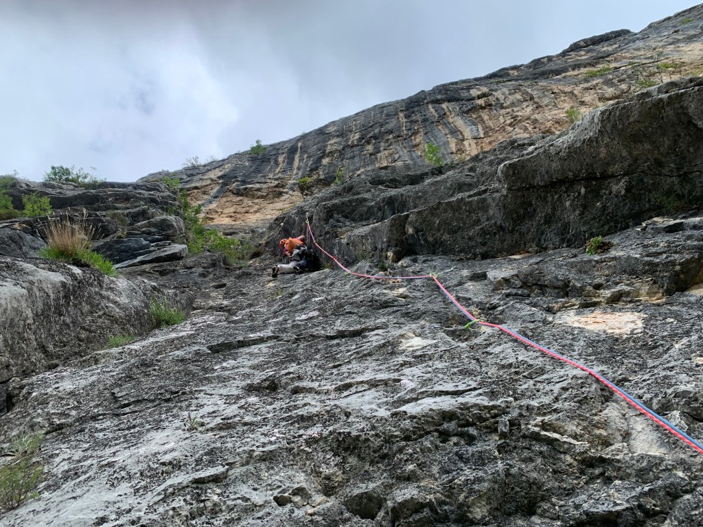 La prima lunghezza è lunga 50 metri e la relazione consiglia di rinviare una corda alla volta per ridurre l’attrito. Il tiro è su roccia abbastanza buona ma un po’ sporca di vegetazione, a metà circa vi è un passo di 6a+ e anche rinviando contemporaneamente le due corde arrivo in sosta agevolmente. A parte la sosta di partenza che ha un fix solo, tutte le altre ne hanno due.
