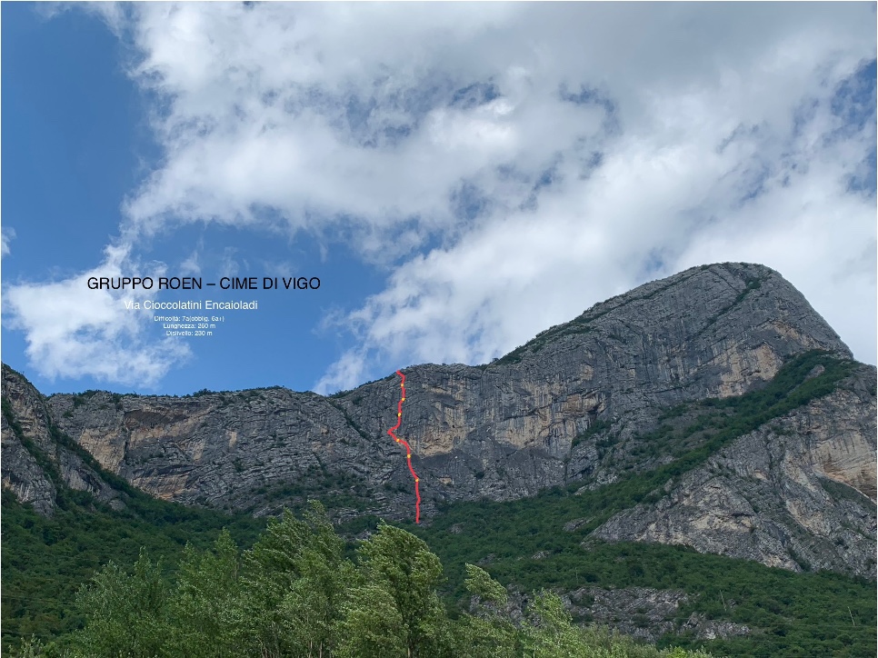 La via è stata aperta nell’autunno del 2017 da Michele Torresani e Roberto Carli. Una relazione più dettagliata si può trovare nel sito della Scuola di Alpinismo Graffer. La macchina si parcheggia a fianco della chiesa dell’abitato di Masi di Vigo. Dopo la salita su strada forestale, arrivati allo spiazzo con panchine e grill, io deciso punto sul sentiero che scende verso la Rocchetta ma dopo un po’ di tornantini in discesa non troviamo la falesia di Tor di Visione con il cordino di acciaio e quindi torniamo sui nostri passi e radrizziamo il tiro quando ritorniamo al bivio su allo spiazzo.Oggi Miriam ha deciso di fare i tiri duri e annuncia che a me toccano i tiri dispari e quindi parto per primo.