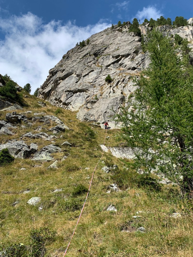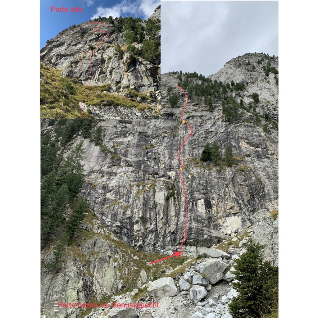 Attacco: l’inizio della via si trova sulla parte centrale della parete e si raggiunge attraversando a sinistra e puntando a una visibile cengia erbosa, sotto a una parte strapiombante, fix e cordino.