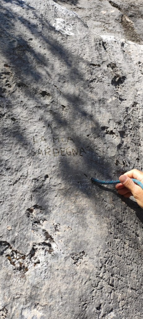 Guardo sulla placca sopra di me e vedo un fix lontano, di solito penso che per arrivare forse non è così difficile, ma per chi ha aperto dal basso arrivare fin lì con il trapano… Abbiamo trovato l’attacco della via con facilità, poco prima, la nostra Svizzera fatta qualche anno prima, si vede ancora il nome sbiadito alla base.
