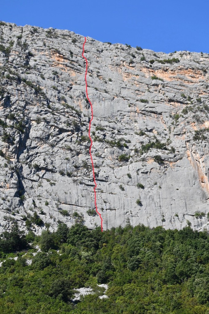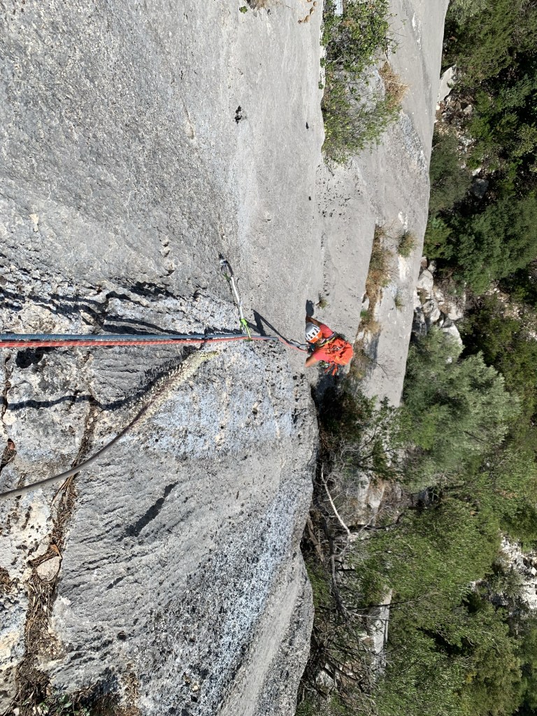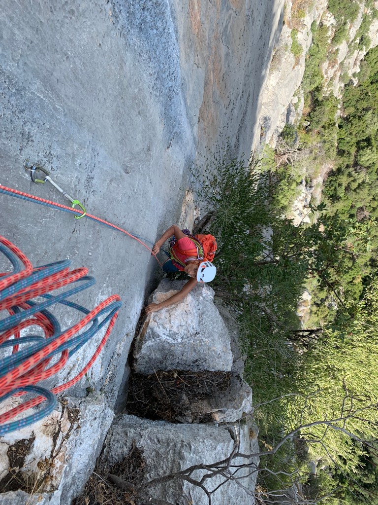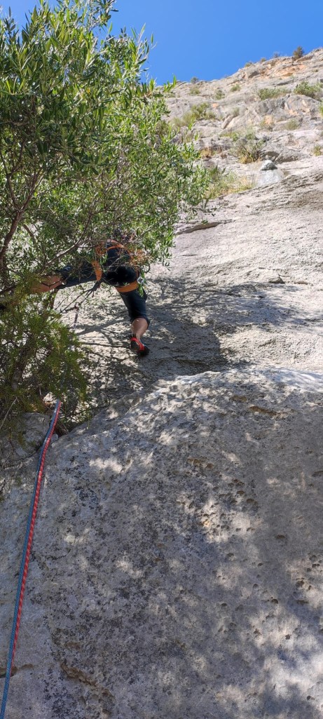 Avevo rassicurata Emanuela dicendo che se l’apritore aveva aperta dal basso e in solitaria la via non avrebbe dovuto essere molto difficile o quantomeno chiodata distante e quindi…sicura. Parto e mi dirigo subito all’albero che sfiora la parete e proteggendomi con un cordino raggiungo la parte alta dell’albero e allungandomi bene a destra tenendomi a delle tacche inserisco il primo rinvio nel fix, il secondo si trova anche molto su, provo ad alzarmi ma i movimenti son delicati e mi riposo al primo fix, uno, due tentativi e riesco ad alzarmi sulle gocce successive e arrivare al secondo fix,poi i passaggi si fanno più semplici e si arriva alla sosta su cengetta.