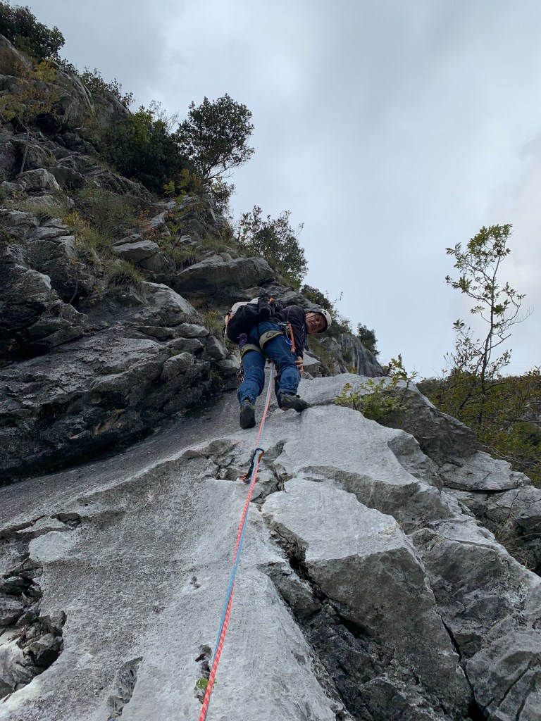 Alla sosta del terzo tiro ammiriamo un camoscio sdraiato sul sentiero di ritorno di fronte a noi che ci osserva pensieroso. Alla fine della via dopo esserci rifocillati risaliamo la traccia che ci porta poi al sentiero di discesa e abbiamo il sole che ci abbandona solamente quando arriviamo all’auto.