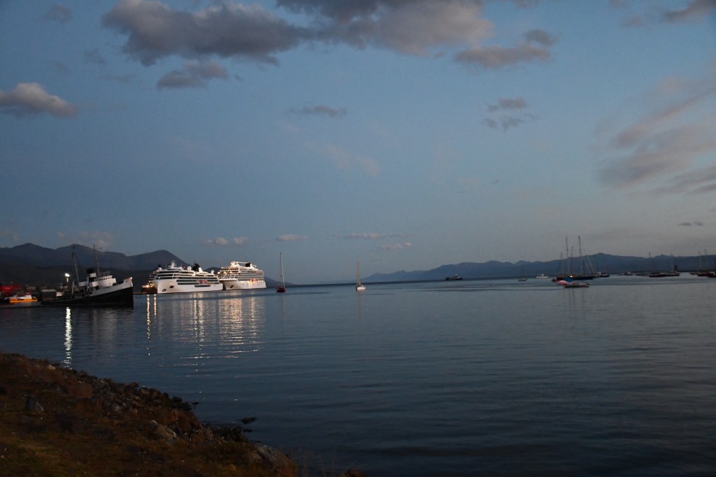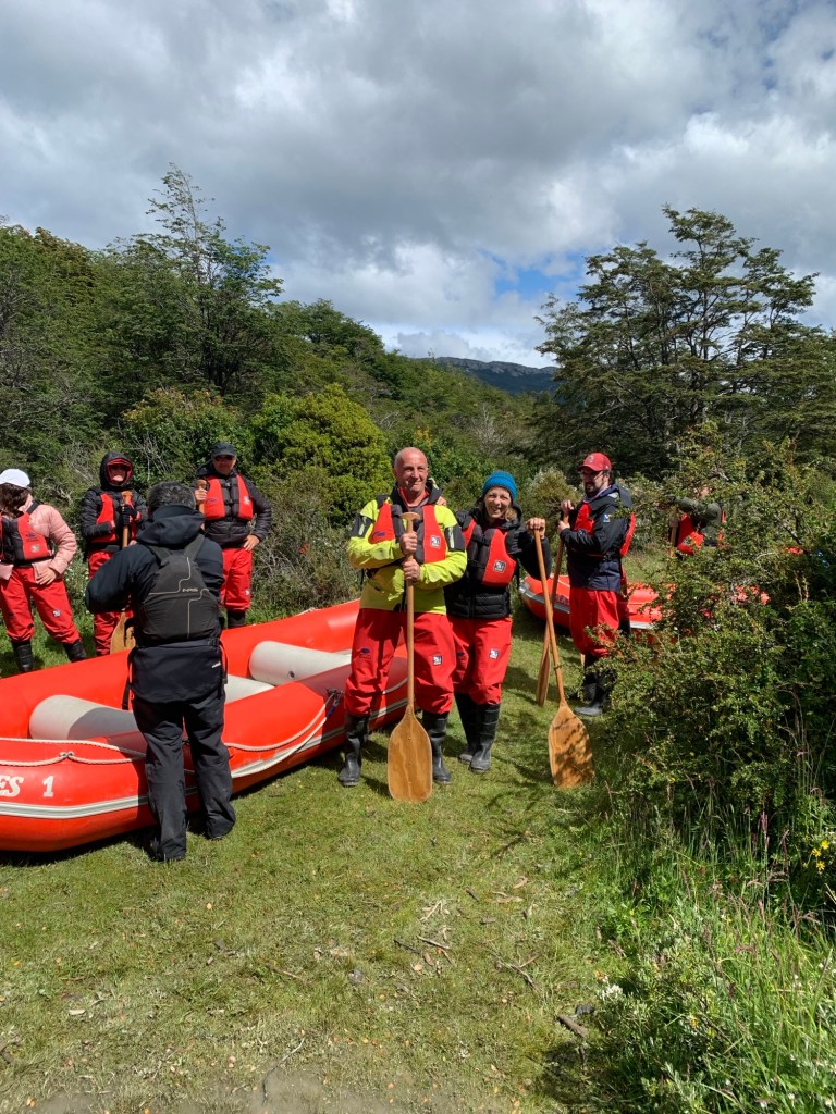 Arrivati alla fine del sentiero e dopo tutte le spiegazioni su flora e fauna impartite, siamo arrivati sulla sponda del Lago Acigami dove abbiamo pranzato in un igloo riscaldato. Fuori pioveva e noi, dopo un pranzo con prodotti locali, siamo riusciti a montare in uno dei due gommoni e discendere il breve tratto di fiume che separa il lago dalla Baia di Lapataia nel Canale Beagle. Fortunatamente il tratto con l’imbarcazione l’abbiamo percorso con il sole. I due equipaggi dei gommoni erano composti di turisti improvvisati canoisti che si sono dati battaglia, in particolar modo nell’ultimo tratto in mare dove la corrente era più forte.