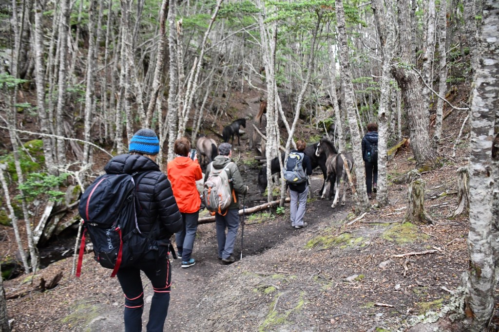 La nostra guida ci ha spiegato che le due specie di alberi che sono più diffuse nel Parco Nazionale della Terra del Fuoco sono la lenga e il guindo, due tipi di faggio che sono molto resistenti al vento e alle basse temperature. Per quanto riguarda la fauna, anche qui è limitata a relativamente poche specie. La volpe rossa fuegina ed il guanaco, tra gli uccelli, i condor, le aquile, i falchi, il picchio di Magellano, lo svasso gigante e l’airone cinerino sono quelli più facilmente avvistabili, poi vi sono anche alcune specie introdotte dall’uomo da diversi decenni e sono la volpe grigia, i conigli europei e il castoro che con le sue dighe provoca seri danni ambientali. I castori, importati dal Canada nel 1946, si sono diffusi enormemente per mancanza di predatori e quindi hanno causato molti danni alla vegetazione. Sul sentiero che abbiamo percorso abbiamo incontrato diversi cavalli che vivono allo stato brado.