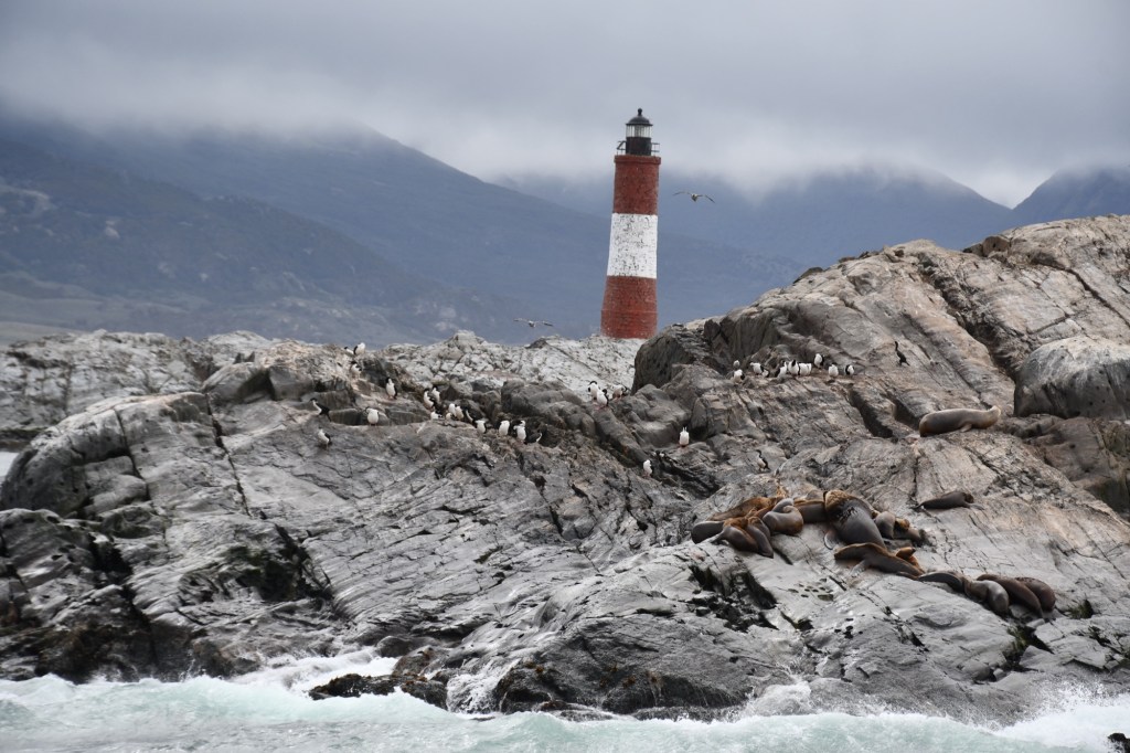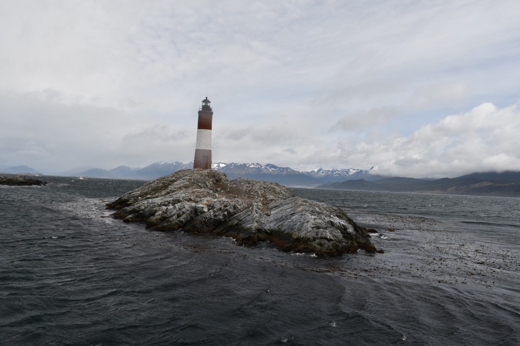 Il Canale di Beagle è lungo circa 240 chilometri ed è largo circa 5 chilometri nel punto più stretto. La breve crociera (durata circa 2 ore e 30 minuti) ci porta prima all’isola Bridges dove sbarchiamo per percorrere un breve tratto a piedi e fare qualche foto; pioviggina e tira vento e rientriamo nell’imbarcazione volentieri. Più avanti arriviamo al Faro Les Eclaireurs dove in un isolotto vicino si possono osservare i leoni marini. Arriva il sole e i turisti scattano moltissime foto con lo sfondo del faro che è il simbolo di Ushuaia. Poi è ora di rientrare, noi abbiamo appuntamento al nostro hotel con il transfer che ci porterà in aeroporto per volare verso El Calafate.