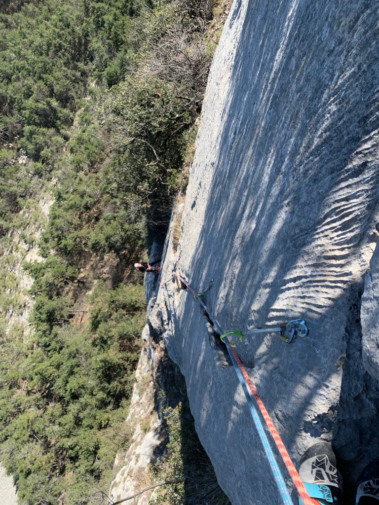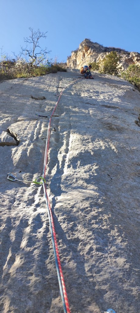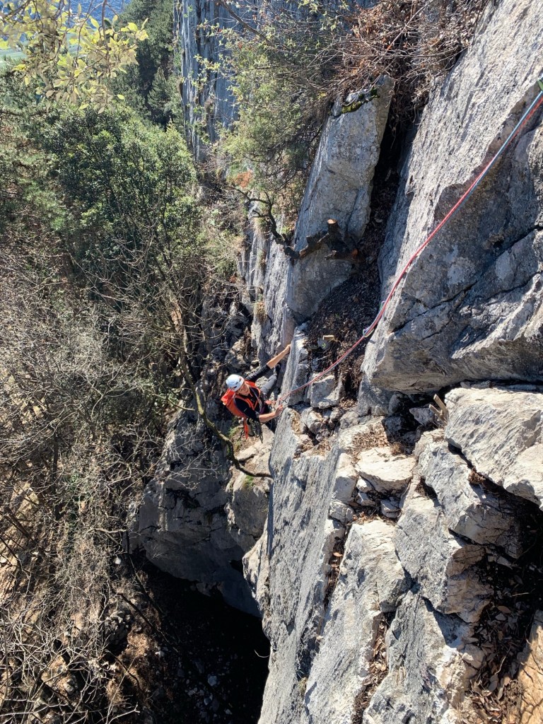 Dalla sosta parte poi uno spezzone di corda che ci permette di uscire nel boschetto sommitale dove ci togliamo l’attrezzatura.