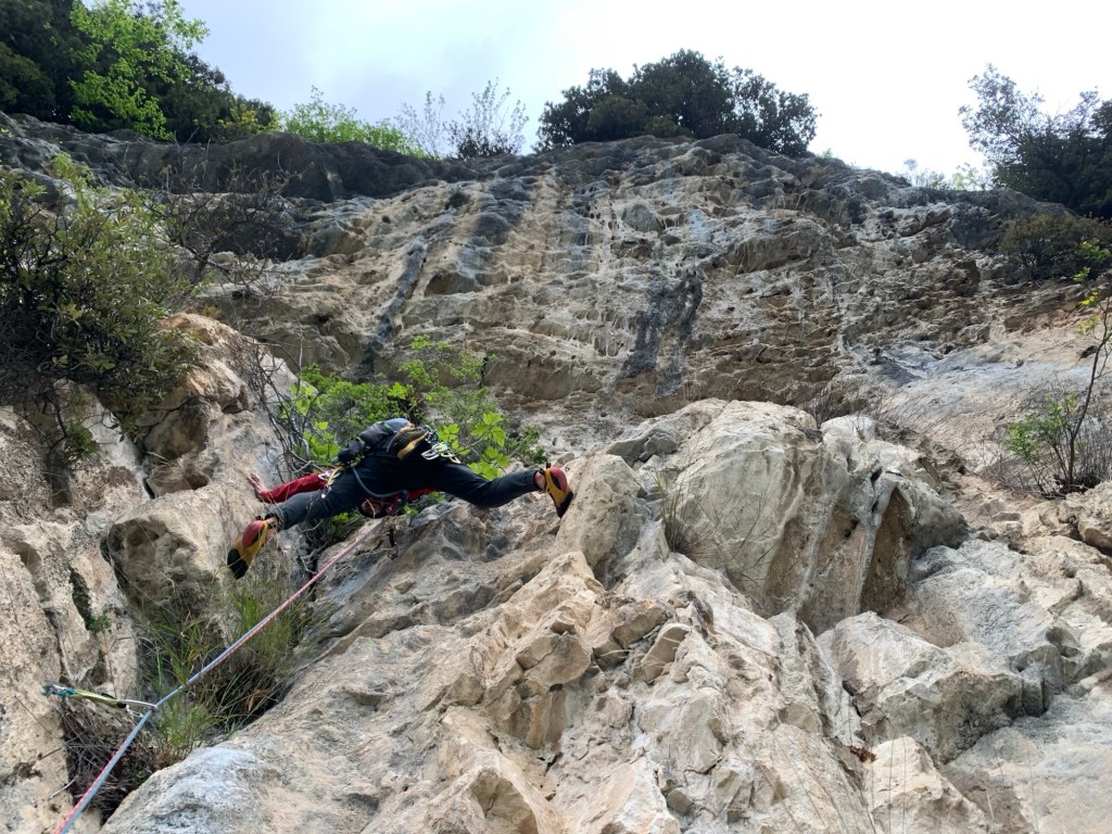 Il quarto tiro prevede un traverso di 7a su manettoni che in un primo momento dalla sosta aerea sono nascosti da arbusti di fico abbondanti di foglie. Dalla sosta ci si abbassa leggermente per prendere una fessura orizzontale da cui spuntano i rami , ma i fix sono vicini e le prese per le mani sono grandi, anche se per i piedi c’è poco e tanta aria sotto il sedere. Dall’altra parte del traverso mi aspetta Nelson sorridente.
