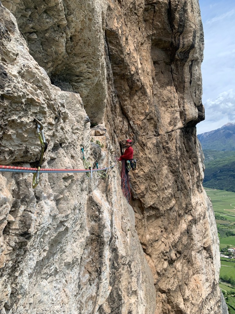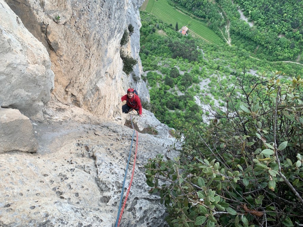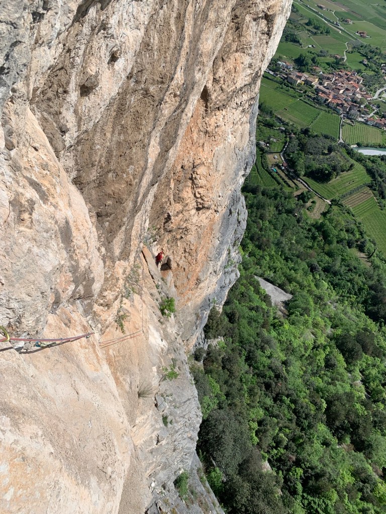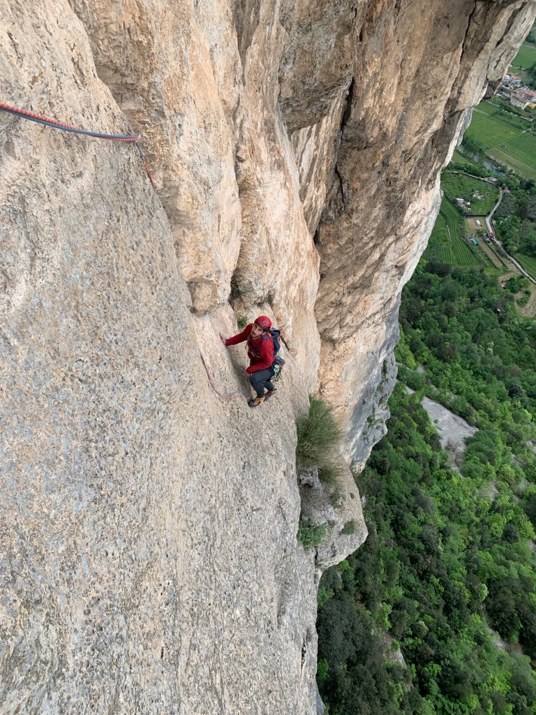 Il nono tiro prevede l’utilizzo di 15 rinvii e dal momento che supera uno lungo strapiombo, sono previsti dei passi in A0. Qui la roccia non è buonissima e comunque si riesce farticosamente ad arrivare in sosta.