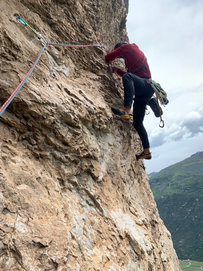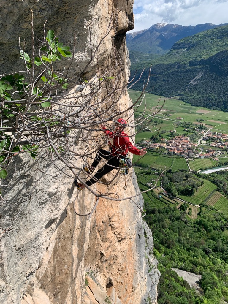 Il tiro successivo prevede 3 passi in A0 e poi 6a+. La pioggia ci ha graziato e fa capolino un po’ di sole, noi continuiamo sui più facili tiri finali, evitando la variante diretta perché troppo difficile.