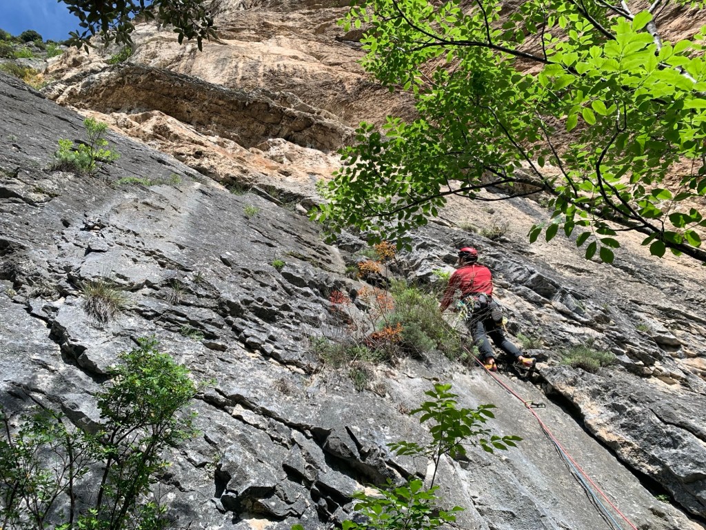 La giornata, secondo Nelson, poteva essere piovosa nel pomeriggio ma ormai avevamo deciso di andare, eventualmente ci saremmo calati se il tempo fosse peggiorato. L’attacco del primo tiro è veramente una tarzanata: ci si arrampica su un albero e dai rami più alti si passa alla parete con roccia un po’ sfuggente ma ben chiodata mista, chiodi normali, spit antico da 8 mm e fix. La nostra va a sinistra e la sosta é su un albero.