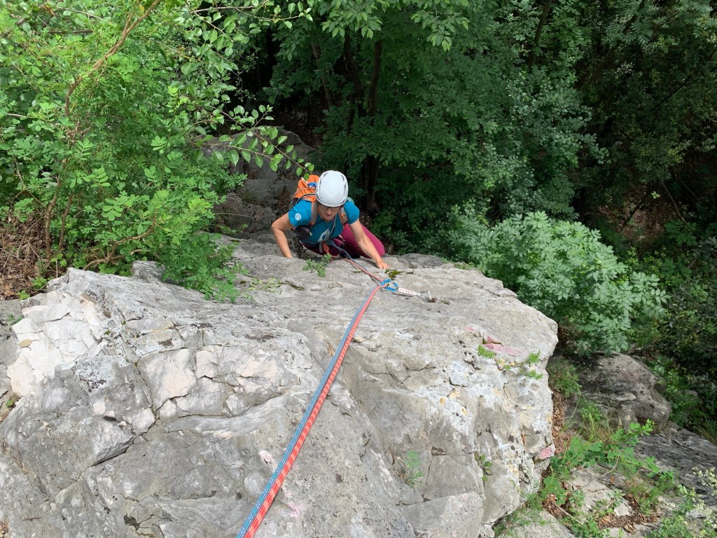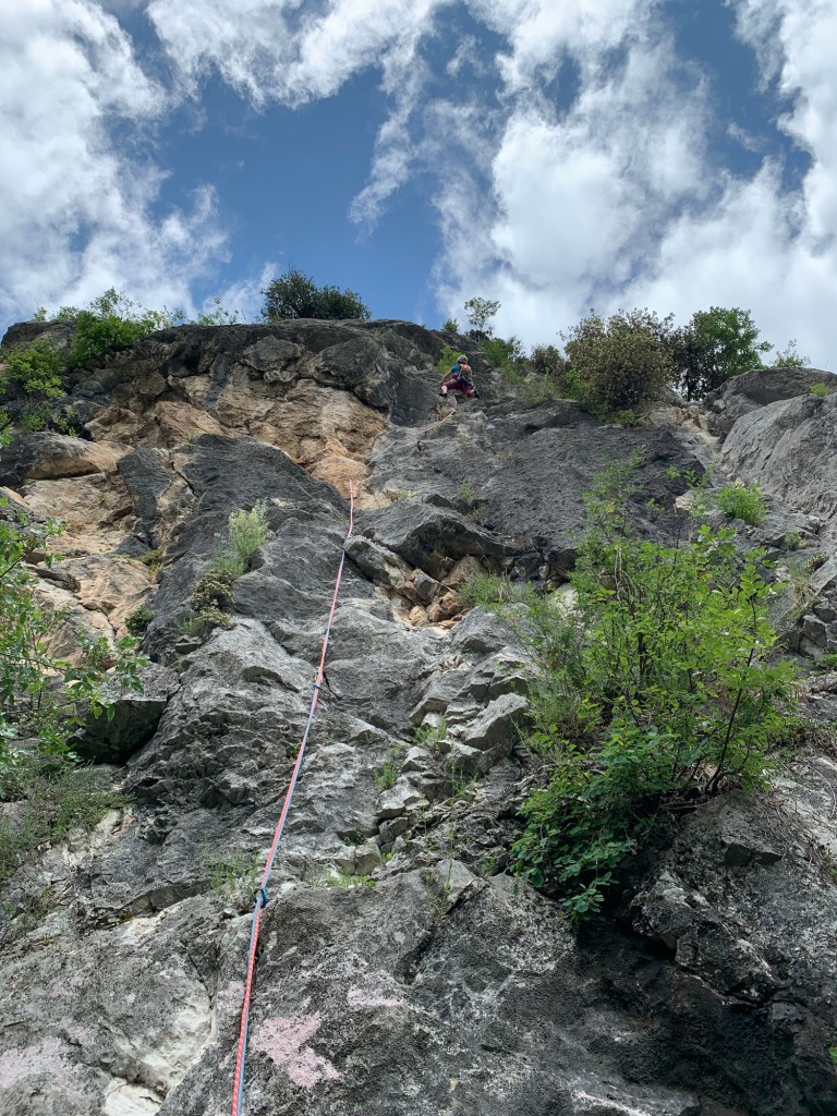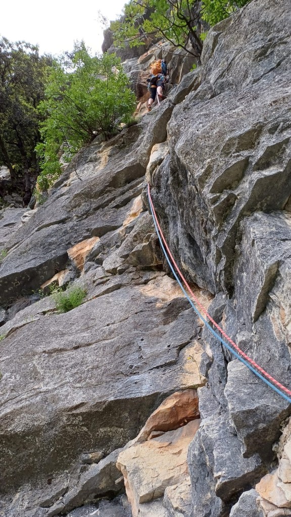 Il terzotiro parte subito su una placca fessurata con andamento obliquo verso destra, e si trovano subito tre chiodi e i movimenti un po’ d’equilibrio ci portano ad una zona più articolata e con ottima roccia che dopo aver toccato molti buchi e prese ottime ci porta in sosta.Sosta 3, 35 m., 3 ch. e 5 cl.,diff. VI+ e VI-. Il quarto tiro è di trasferimento verso sinistra in un boschetto.Sosta 4,25 m., diff. I. Il tiro successivo parte dalla sosta sulla cengia(sosta su fix ad anello + clessidra) rimontando a sinistra su uno strato di roccia fino a prendere la parete di rocce rotte(all’apparenza) per poi spostarsi a destra a prendere una fessura che porta verso l’alto da prender in dülfer all’uscita e spostarsi a sinistra alla sosta. Sosta 5, 25 m., 2 ch. 3 cl., diff.VI-.