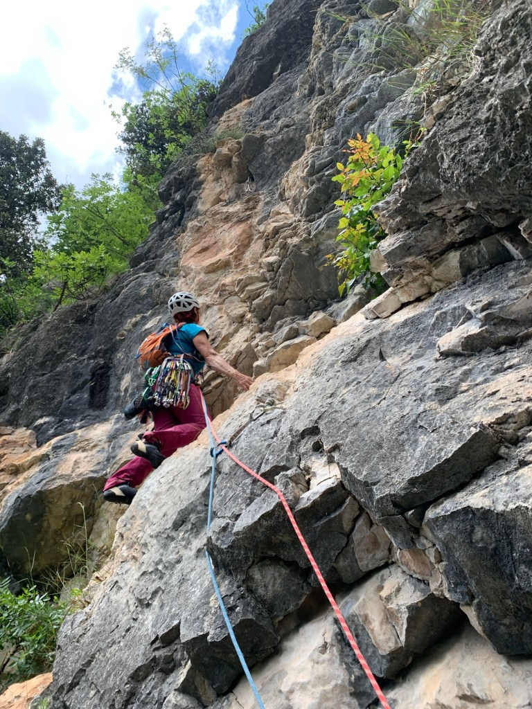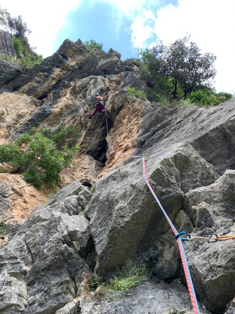 Il secondo tiro sale diritto sopra la sosta e punta ad un tetto pronunciato con roccia gialla/rossastra, Kathrin sale con circospezione su quello che potrebbe essere un diedro poco accentuato ma fessurato nella parte alta e permette l’inserimento di friends, la roccia è ottima e solo dopo aver posizionato il rinvio nel fix poco sotto il tetto e un po’ a destra si riesce a ragionare meglio anche se proprio lì è il passo chiave del tiro, subito dopo una buona presa fessurata permette l’inserimento di un piccolo stopper che al mio turno fatico non poco a togliere, poco più sopra un buon chiodo rappresenta un’altra ottima protezione e finalmente si esce a sinistra in sosta. Sosta 2, 30 m., 1 fix, 2 ch.,e 3 cl.diff. VI e V+.
