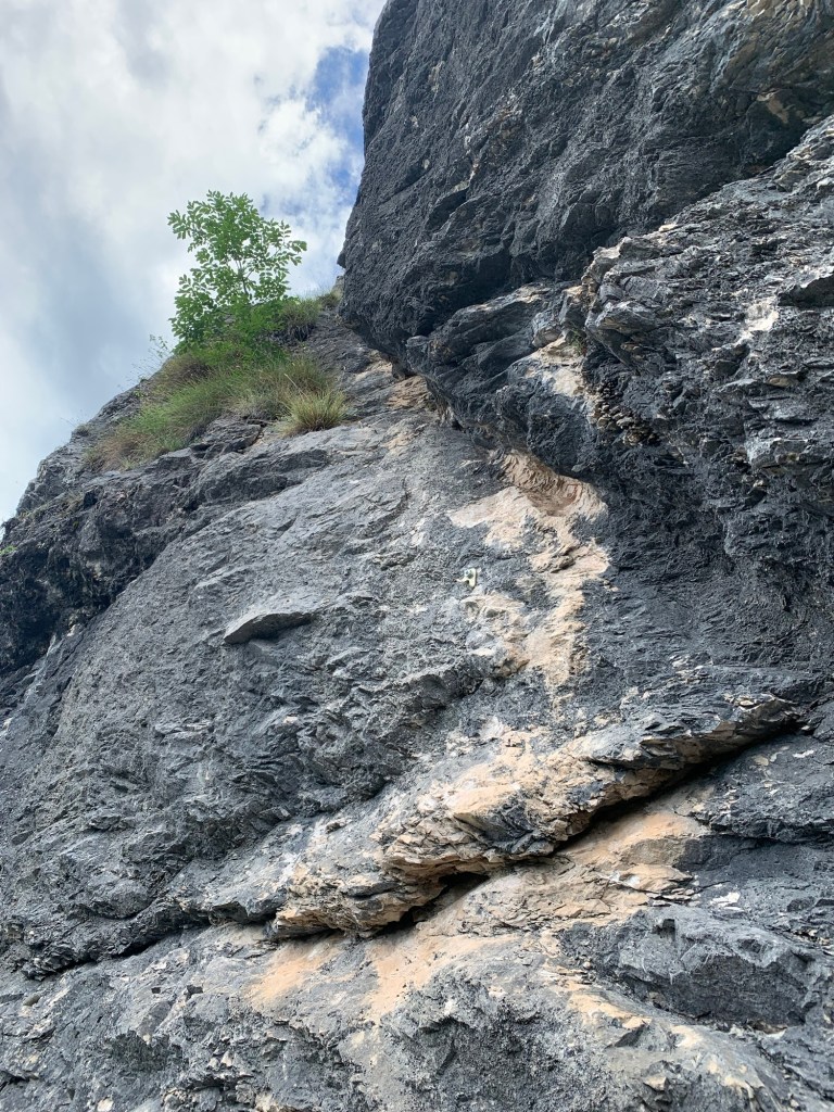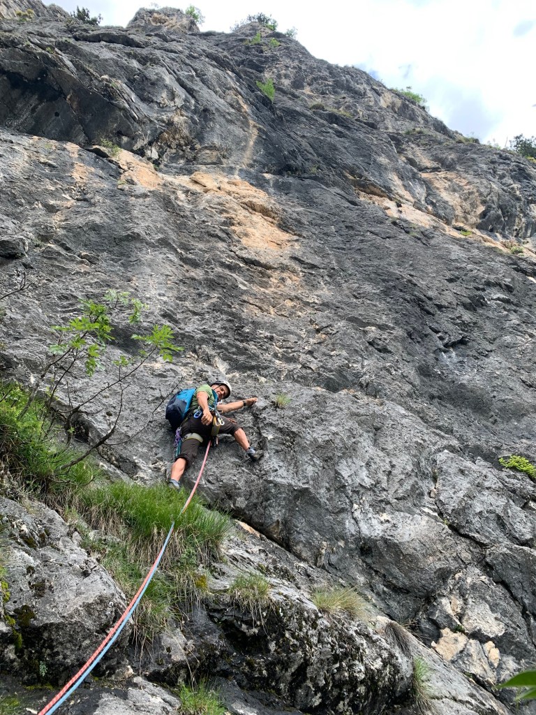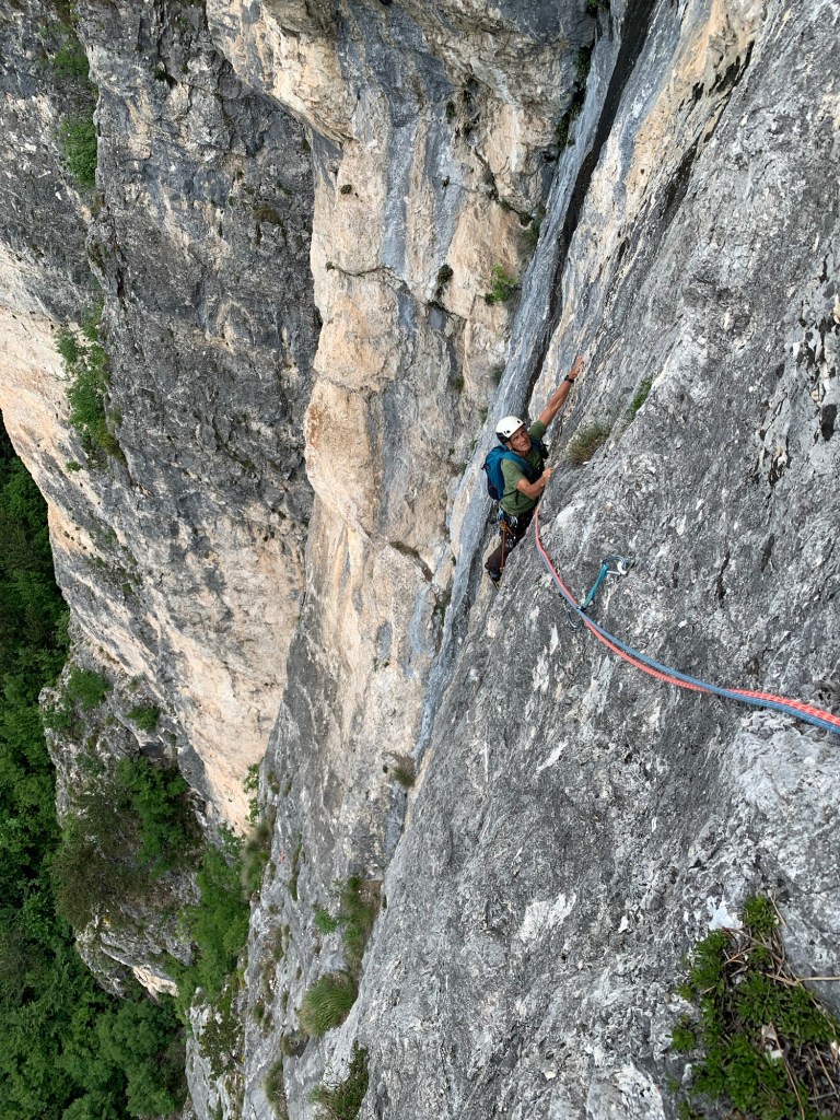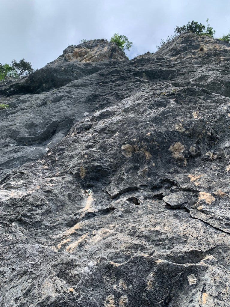 Il sesto e ultimo tiro supera la placca a destra della sosta a prima vista abbastanza liscia. Dopo i primi metri meno difficili si supera una colata scura proveniente dall’alto ma misteriosamente asciutta anche dopo una nottata di pioggia, e inizia un tratto impegnativo che noi gradiamo mezzo grado in più della relazione, poi di nuovo il facile fino alla sosta oltre il bordo della placca e all’inizio del pendio boscoso. Sosta 6 su due fix, 20 m. 5 fix, diff., 6b.