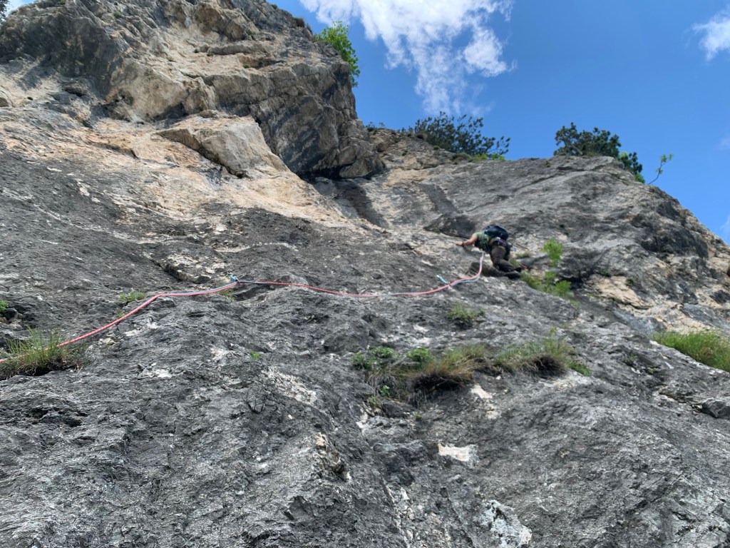 Il terzo tiro parte verso destra su roccia sporca di zolle d’erba, tra il primo fix e il secondo c’è un albero per un eventuale ancoraggio con cordino, si continua poi sotto uno strapiombo con lama prima e poi fessura che ci porta sotto una parete più verticale ma appigliata, dopo esserci alzati fino all’altezza di alcuni cespugli che rimangono a destra, ci si sposta a sinistra con movimenti più tecnici fino a raggiungere una lama ben appigliata e ci si sposta a destra verso la sosta. Sosta 3 su due fix, 30 m., 8 fix, diff., 6a+.