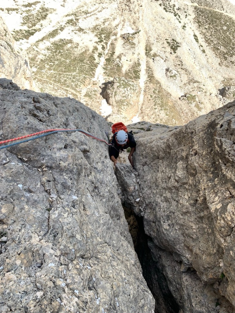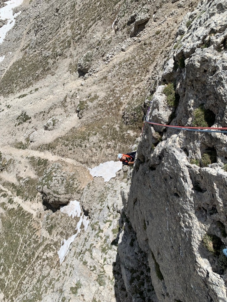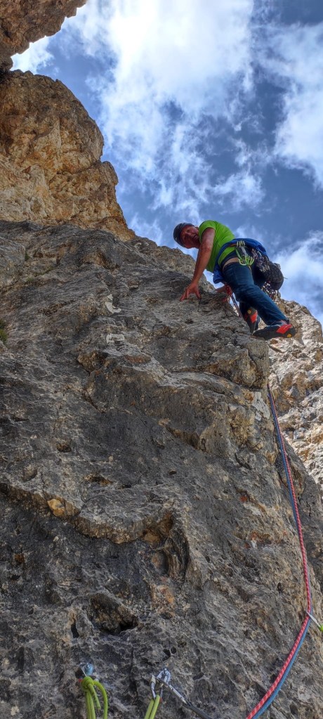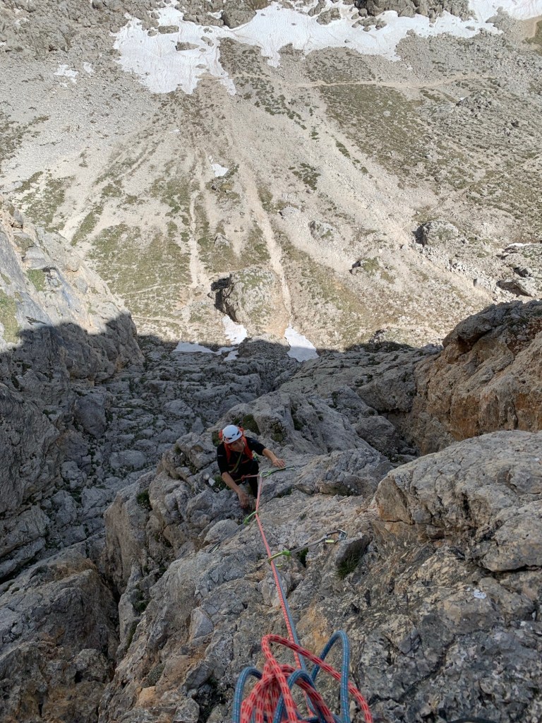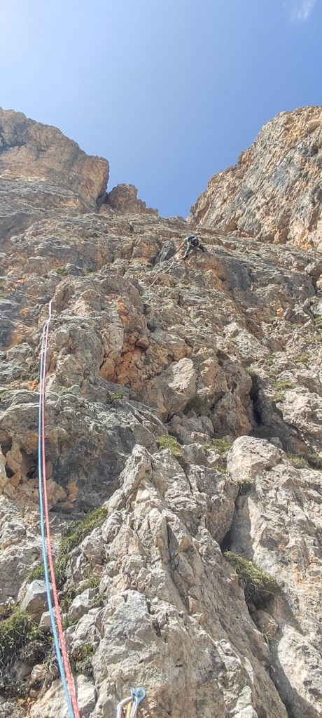 Oggi ci siamo dedicati alla ripetizione di una via aperta da poco in una zona molto vicino al Rifugio Roda di Vael sul Catinaccio. Questo itinerario è stato aperto nel 2022 da Rasom G. e Rasom A. La relazione è presente sul sito del rifugio Roda di Vael. È una via di cinque tiri e quindi breve e a breve distanza dal rifugio. La chiodatura è sufficiente a fix sempre presenti nei passi impegnativi. Noi, non avendo informazioni in merito ci siamo portati i friends che poi non abbiamo utilizzato. Lungo la via si trovano anche clessidre e possibilità di usare protezioni mobili. Le soste sono tutte attrezzate con due fix, alcune con due fix con anello (presumibilmente per la discesa in doppia)ma i fix non sono collegati tra loro con cordone.