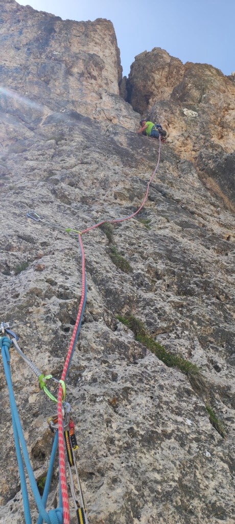 Il quarto tiro, ci si sposta a destra a prendere il filo dello spigolo, qui la roccia è bella e lavorata, più sopra dopo un breve tratto un po’ adagiato si arriva a salire delle rocce che sembrano un po’ pericolanti ma sempre tenendo il filo dello spigolo si arriva in sosta.Sosta 4, 25 m. 8 fix, diff., 6a.