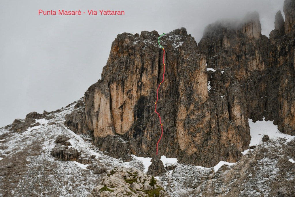 Accesso: Dal Rifugio prendere il sentiero per la ferrata Masarè e quando questo passa sotto la dirittura della Punta Masarè salire per il ghiaione puntando ad un grande masso, oltre questo si scorge già sulla parete l’attacco della via(due fix e un cordino giallo) fino a qui 20 minuti.