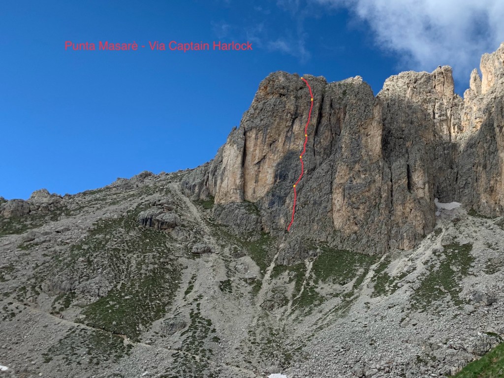 Accesso: Dal Rifugio prendere il sentiero per la ferrata Masarè e quando questo passa sotto la dirittura della Punta Masarè salire per il ghiaione puntando ad un grande masso, oltre questo puntando leggermente a sinistra salire fino alla base del camino obliquo che taglia la parete verso destra. Poco più in basso e a sinistra è visibile un fix con cordino giallo e la scritta Tadasci, noi ci siamo imbragati qui perché più comodo. La via però parte una decina di metri più sopra verso destra (cordino viola in clessidra).