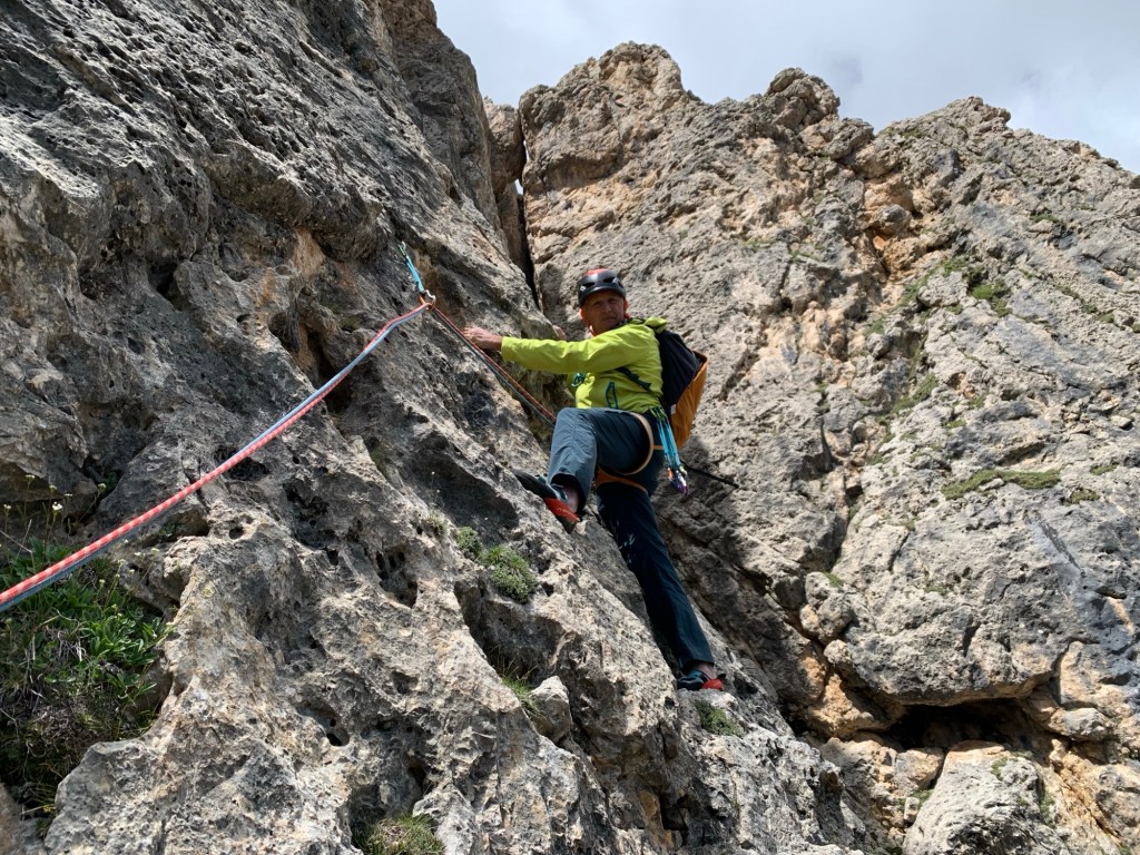 Discesa: dalla quinta sosta si può scendere con doppie da 30 metri(opzione non testata), ci si può calare per il canale lato sud e successivamente per rocce ed erba raggiungere il sentiero terminale della ferrata Masarè che porta al rifugio oppure come già fatto per la discesa della via Yattaran, ci siamo slegati e siamo saliti per la rampa a destra per circa 30 metri fino a raggiungere la forcella erbosa e da lì sul versante a sud una traccia facile si congiunge al sentiero che poi porta a sinistra verso il rifugio (questa opzione da me testata mi sembra la più semplice).