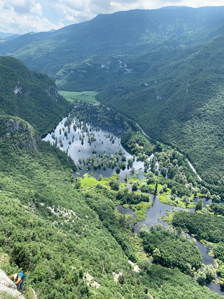 Dalla sosta del primo tiro guardo giù verso la valle e vedo la bellissima area palustre di Loppio (la più grande del Trentino), colma di acqua grazie alle abbondanti piogge di questa primavera. In precedenza, in questa valle, nel 1439 è passata una piccola flotta di imbarcazioni veneziane provenienti da Venezia. Risalendo il fiume Adige e poi trascinandole via terra fino a Torbole, sono riusciti a riconquistare il Lago di Garda dalla marina del ducato di Milano. Questo settore è stato considerato alpinisticamente solo da poco tempo. Nell’ultima guida di Diego Filippi viene riportata solo la via “L’alpinista dai capelli bianchi”, aperta nel 2017 da G. Perenzoni e G. Spagnolli. La via da noi ripetuta è stata aperta di recente e le informazioni le ho prese dall’articolo di M. Giordani sul blog orizzontidolomitici.wordpress.com. Ultimata negli ultimi mesi del 2023 da M. Giordani, S. Martini e W. Manzi, viene descritta come una linea meritevole di essere ripetuta. Ed eccoci qui.