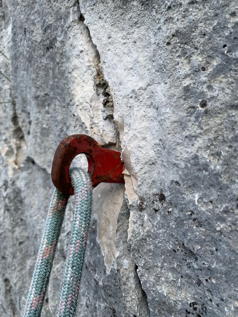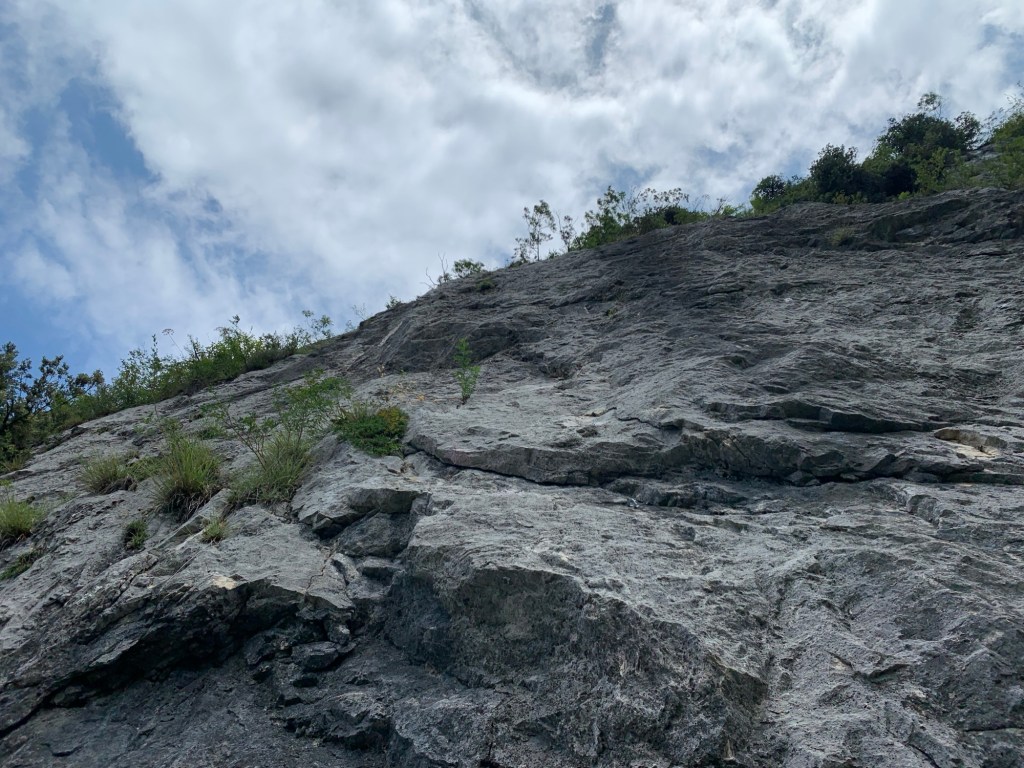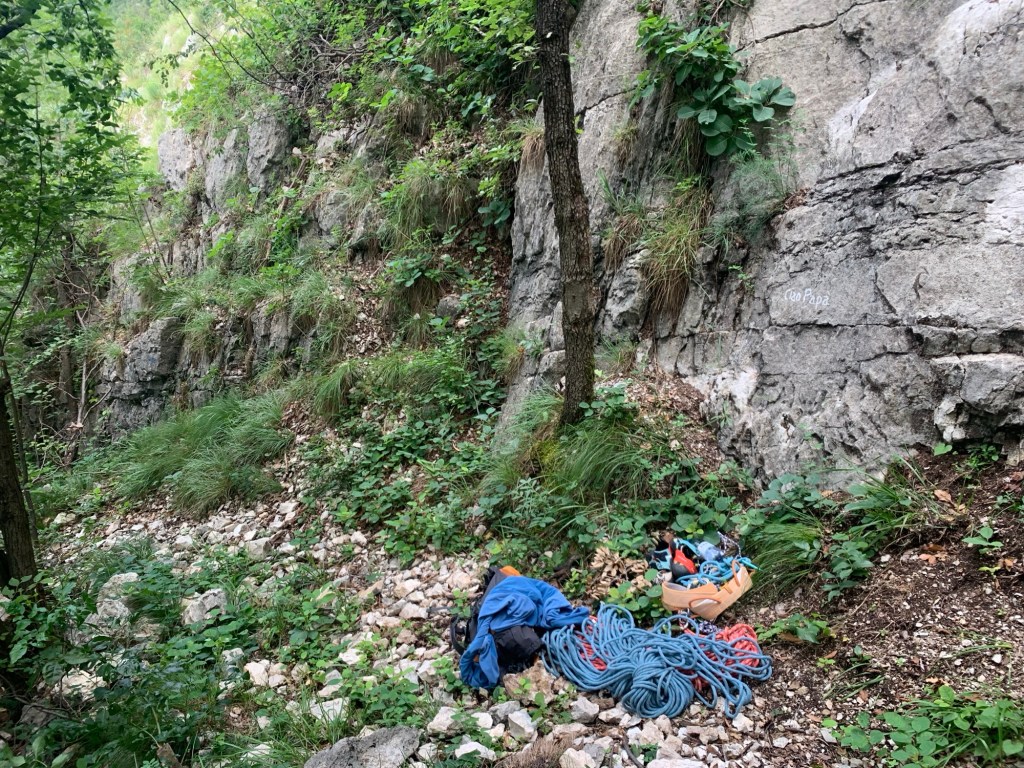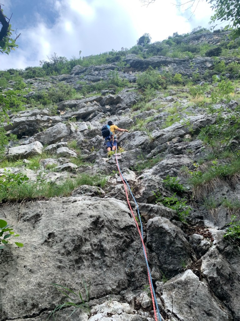 Relazione: Il primo tiro parte direttamente dal sentiero e segue delle fasce terrose dove la vegetazione è meno presente. Si notano i fix e i cordini lungo il percorso. L’arrampicata è facile e non particolarmente attraente. Sosta 1, 50 m, 4 fix, 2 chiodi, 1 cordone su albero, difficoltà 4+.