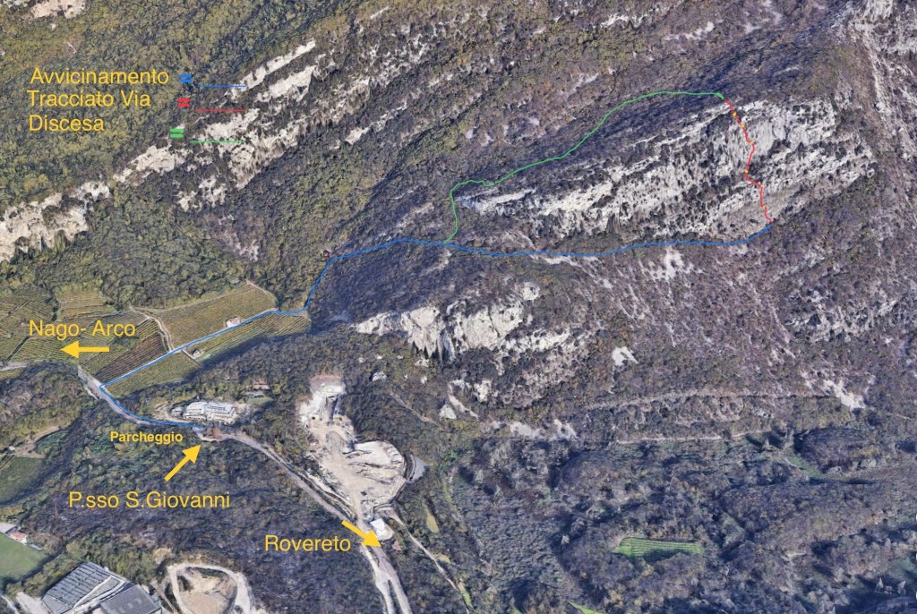 Avvicinamento: Noi abbiamo parcheggiato l’auto al Passo S. Giovanni, provenendo dal casello autostradale di Rovereto Sud, e abbiamo lasciato il veicolo nello slargo a destra, poco prima del cartello indicatore del Passo. Da qui abbiamo preso la ciclabile in direzione Nago per qualche decina di metri fino a che questa fa una curva a destra e scende. A questo punto, abbiamo seguito la strada fino ad imboccare la prima strada a destra che entra in campagna. In fondo alla stradina, sulla destra, parte una traccia di sentiero leggermente in salita per poi diventare sempre più erto. Finita la salita, il sentiero diventa pianeggiante e passa davanti a una grande roccia scavata, segno di un ricovero di guerra. Poco più avanti, ad un bivio, prendere il sentiero che inizia lentamente a scendere a destra (quello a sinistra che sale è quello di discesa). Si continua a seguire il sentiero fino a che questo tocca la roccia dove parte la via (scritta alla base). Dall’auto, circa 40 minuti.