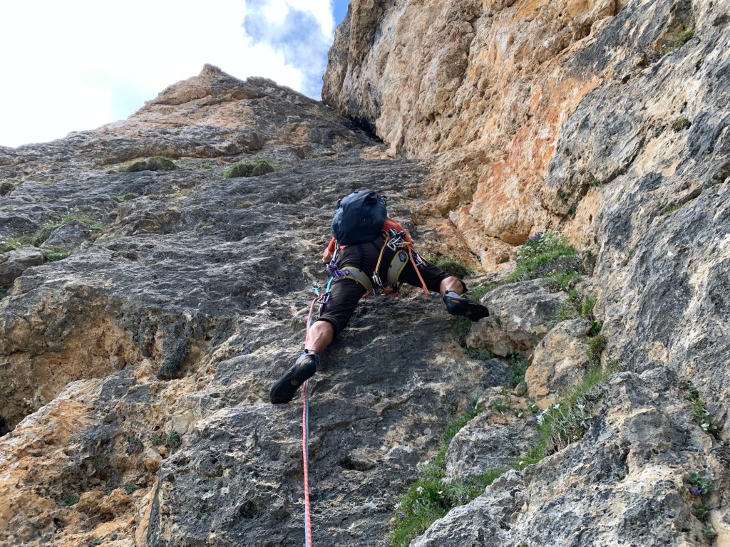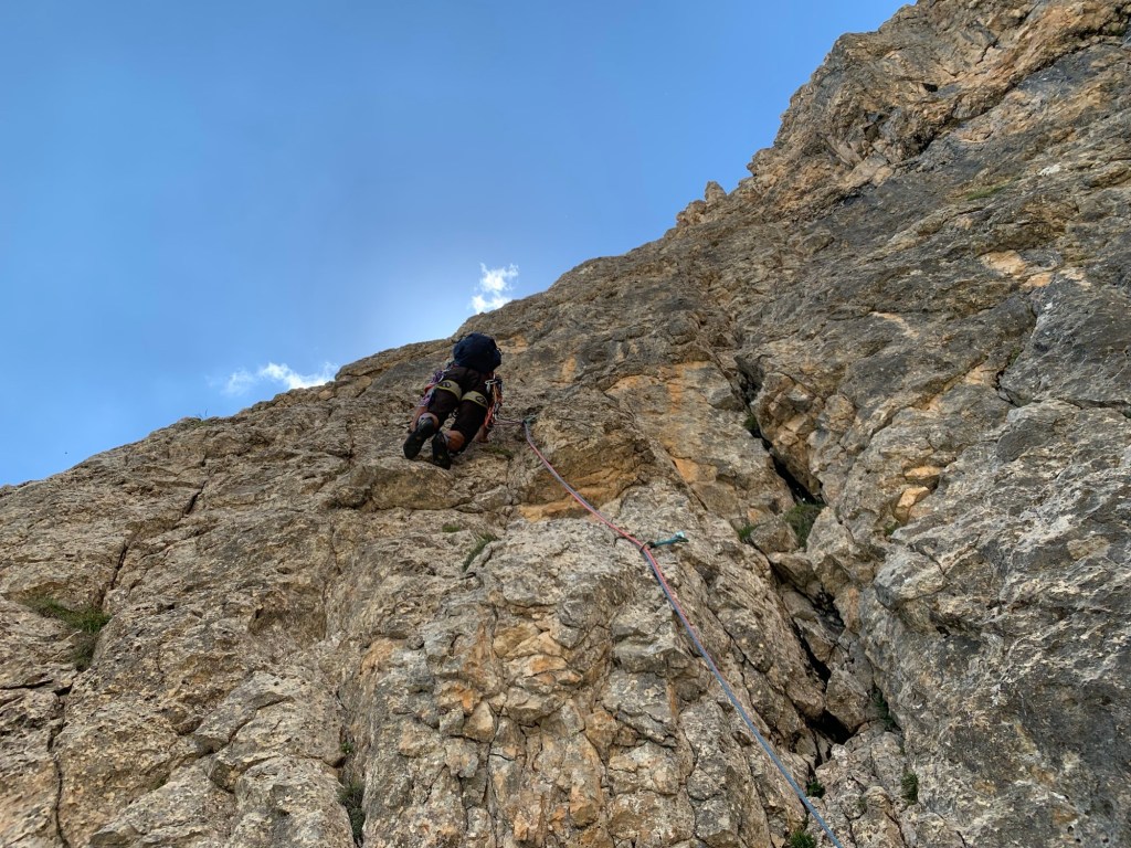 La quinta lunghezza sale sopra la sosta un po’ a sinistra a superare una fessura/diedro per qualche metro poi su facili rocce e zolle erbose alla sosta verso destra. Sosta 5, 20 m.,3 fix, diff.5b.