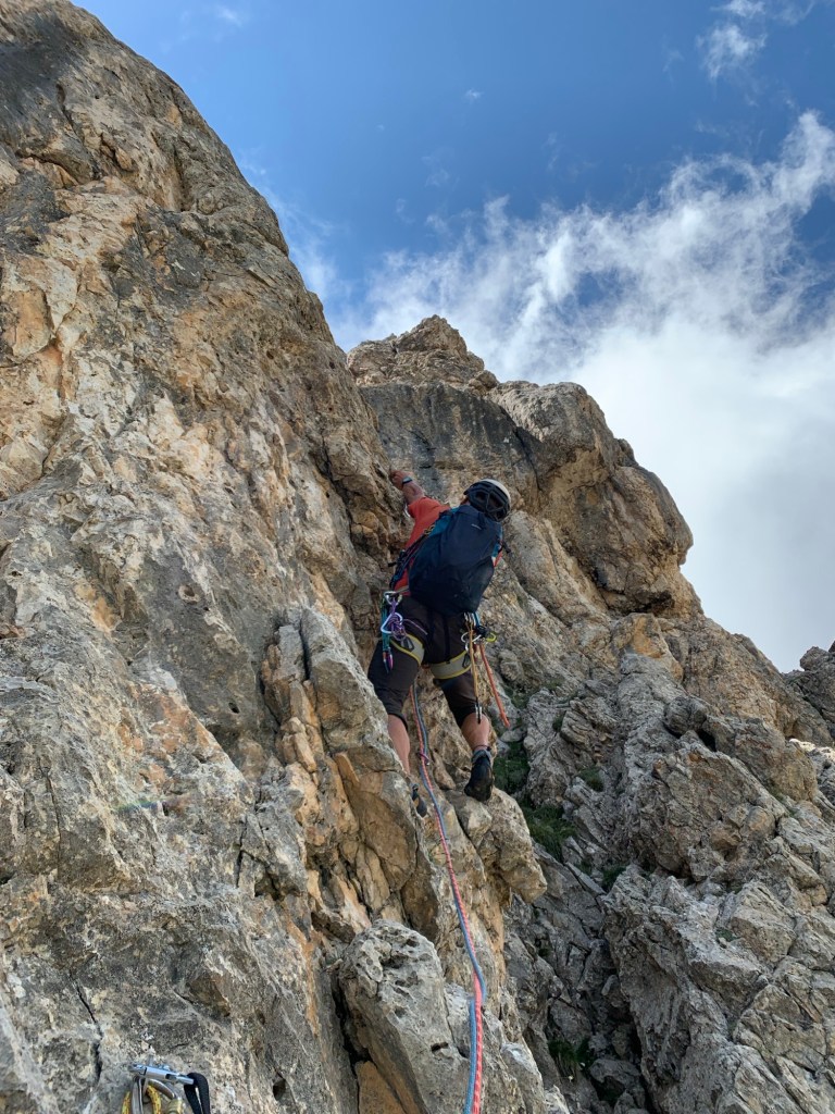 Nel terzo tiro si parte obliquando a destra verso il grande diedro giallo per poi ritornare in parete a sinistra su parete gialla per poi rientrare a destra superando una pancia con un pò d’impegno quindi ritornando verso il diedro e sotto un sasso incastrato che aggirato lo a sinistra fungerà da basamento della sosta.Sosta 3, 35 m., 14 fix, diff. 6a+.