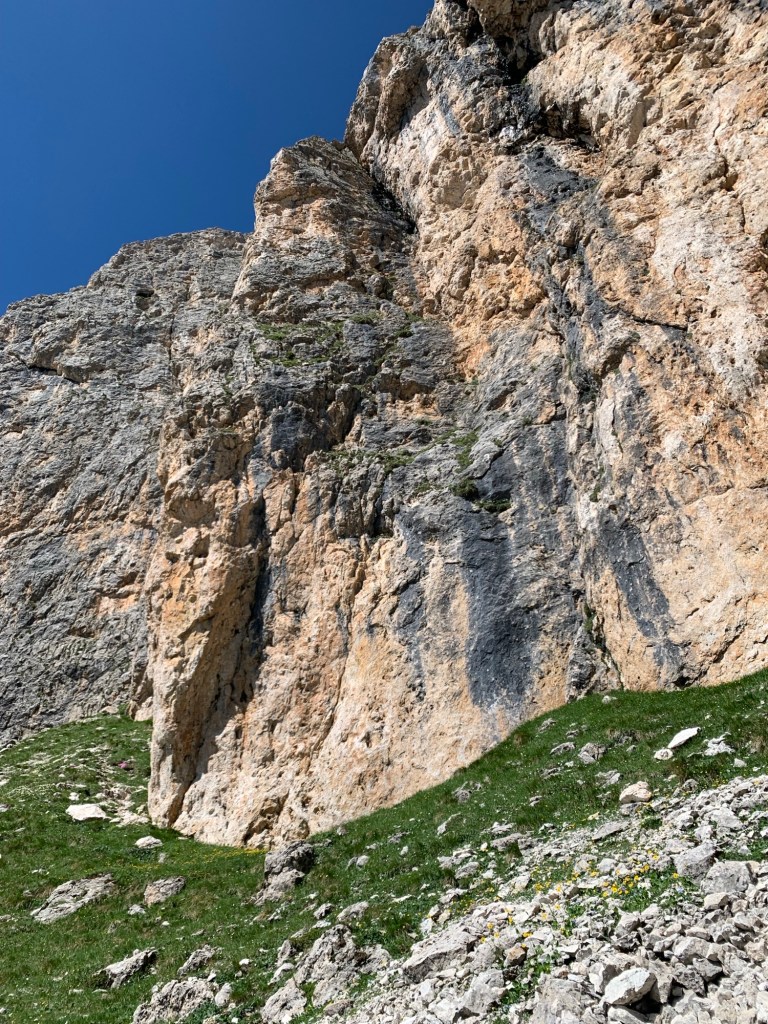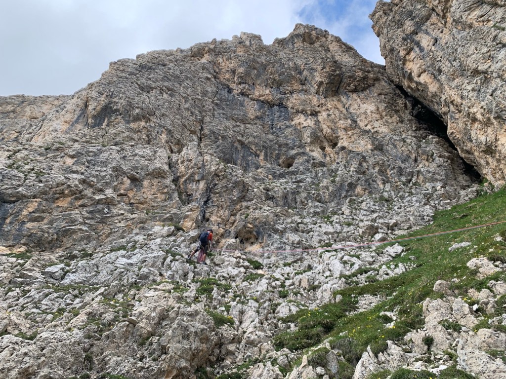 Avvicinamento: dal Rifugio Roda di Vael si prende il sentiero per il Croz di Santa Giuliana. Noi abbiamo risalito il sentiero fino a una traccia poco accentuata che si diparte verso sinistra, all’incirca alla stessa quota della partenza della via, e si traversa per pendii erbosi fino all’attacco (20 minuti dal rifugio).