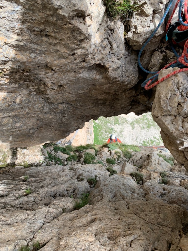Il secondo tiro parte diritto sopra la sosta per poi traversare a sinistra un paio di metri (qui il passo di 6a) si continua diritti fino alla sosta su roccia molto bella.Sosta 2, 15 m.,4 fix,diff.6a.