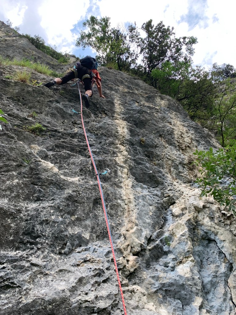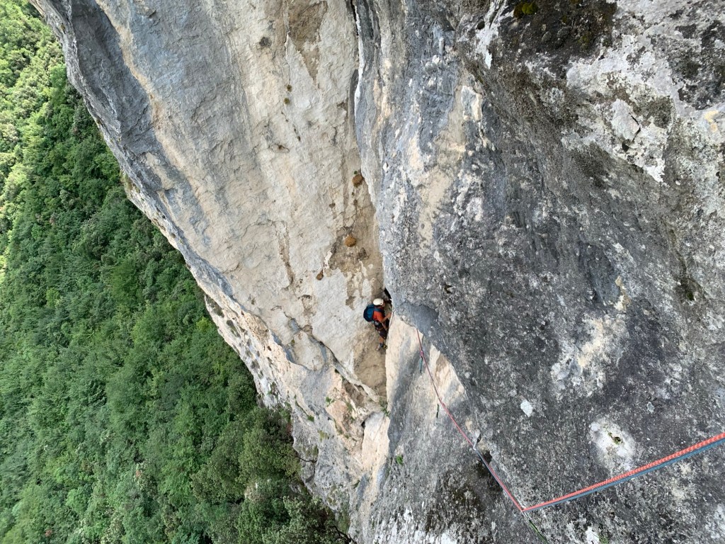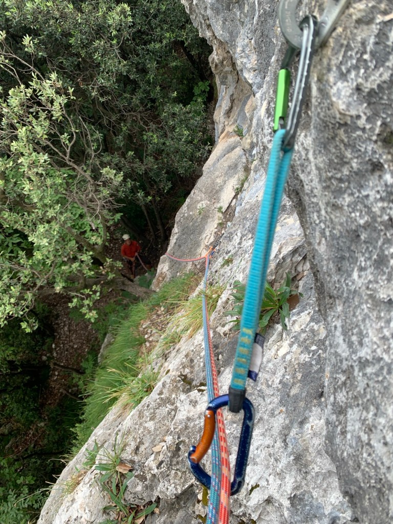 Secondo tiro: Supera il muretto verticale sopra la sosta, ben appigliato, e esce a sinistra alla base di una rampa verso destra. Raggiungere un boschetto dove si sosta. Sosta 2, 25 metri, 5 fix + 2 cordoni su piante, difficoltà 5c.