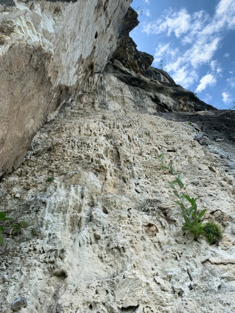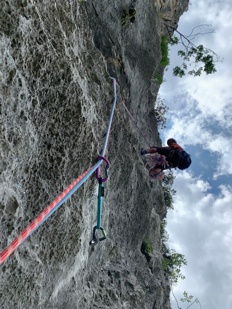 Quinto tiro: Partire dalla sosta tenendo leggermente la sinistra, per poi rientrare a destra su prese oblique (una di queste un po’ ballerina). Si arriva alla sosta sul bosco sommitale. Sosta 5, 23 metri, 5 fix, difficoltà 6a.