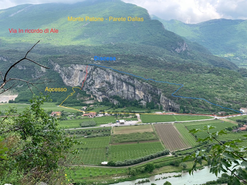 Accesso: Provenendo da Trento sulla SS 45bis, superato il paese di Drò e il distributore Eni sulla sinistra, poco prima del semaforo in località Moletta girare a sinistra e costeggiare la parete trovando un posto per parcheggiare nelle vicinanze del ristorante/pizzeria Villa Giara. La strada prosegue e al primo bivio prendere a destra. Superata una casa con cancello con ai lati due statue di leoni, proseguire fino a costeggiare un terreno recintato con un’inferriata. Alla fine del recinto, prendere una strada sterrata che si inoltra a destra. Subito sulla destra, un cancello permette di entrare (attenzione, siamo su terreno privato). Una traccia conduce alla falesia “Piccola Dallas”. Raggiunta la falesia, tenere la destra e superato l’attacco della via Kluckner-Sartori, scendere in leggera discesa nel bosco fino all’attacco con targhetta alla base (15 min).