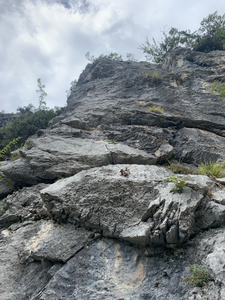 Relazione della via :salire la fessura che taglia la placca a sinistra, quindi spostarsi a destra per raggiungere la base di un’altra placca. Questa presenta un traverso a sinistra, appena sopra un tetto che sovrasta l’attacco della via. La placca è inizialmente verticale, ma poi si inclina leggermente a destra, conducendo a una placca lavorata con buchi e numerose clessidre che porta alla sosta.