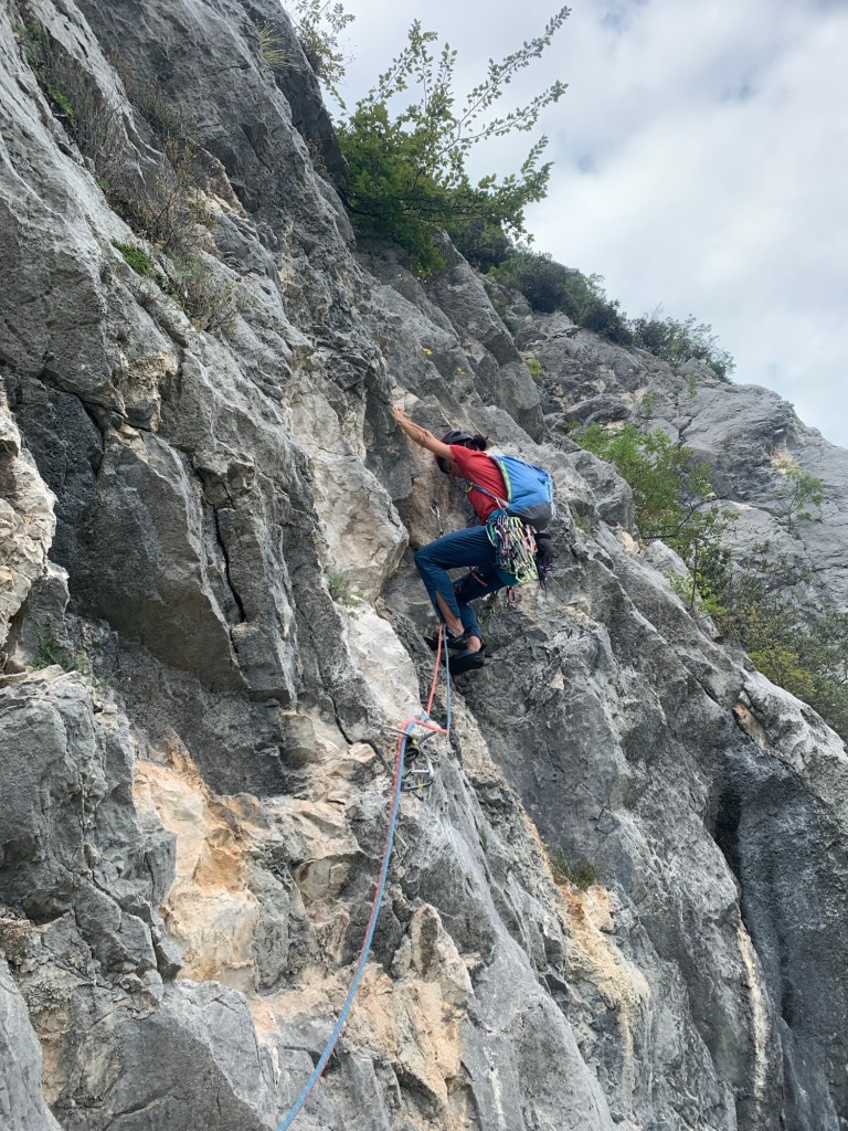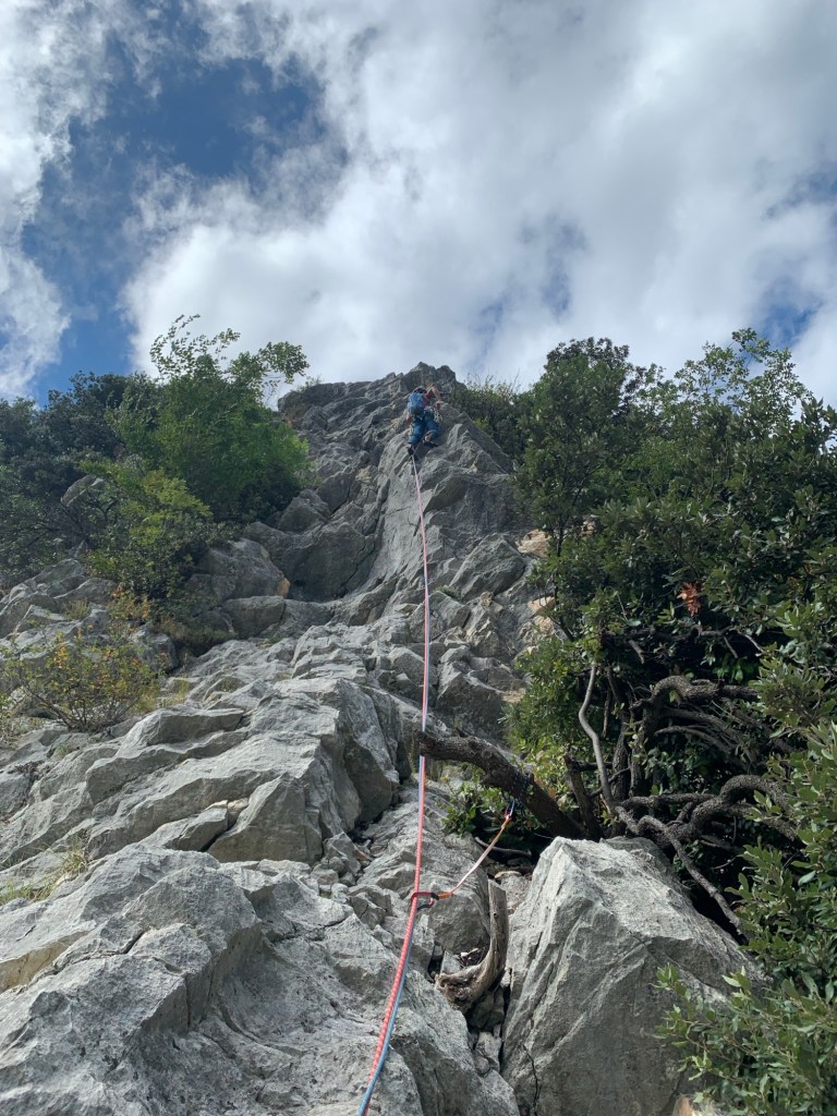 Traversare a destra aggirando uno spigolo. L’arrampicata è delicata a causa di grossi massi che sembrano instabili. Si procede verticalmente su una placca fino a raggiungere la cresta, con passi delicati fino alla sosta.