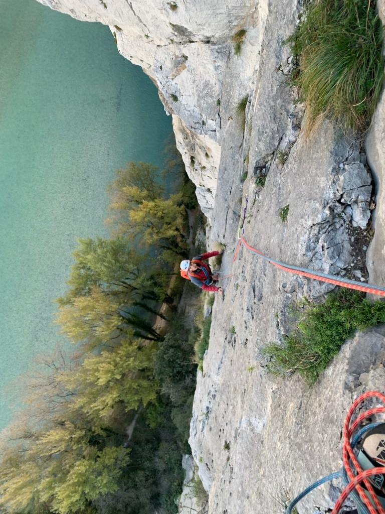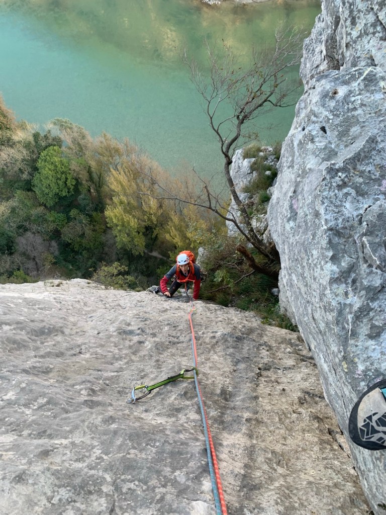 La seconda lunghezza sale diritto sopra la sosta dove forzatamente volgo lo sguardo a destra e a sinistra dove si vedono altri fix di altre vie, mi alzo su diritto su prese taglienti il passo qui sopra è sostenuto sul verticale poi la parete si adagia un po’ e si continua su buone prese fino alla sosta che io sbagliando faccio a sinistra mentre è due metri più a destra. Sosta 2, 35 m., 13 fix, diff., 6b.